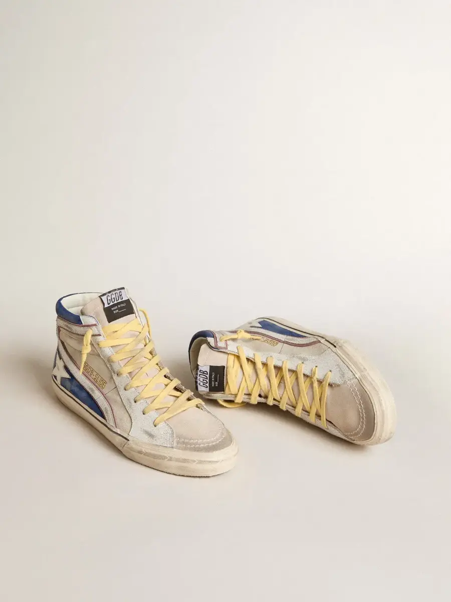Alma skater, actitud glamurosa. Nuestras zapatillas Slide te transportan directamente a Venice Beach, entre un ollie y un kickflip. Este modelo, con parte superior de lona color perla y ante azul, cuenta con una estrella de cuero blanco e inserciones de cuero craquelado blanco, como el flash con ribete de ante rosa. La lengüeta de ante beige y los cordones amarillos completan el look.