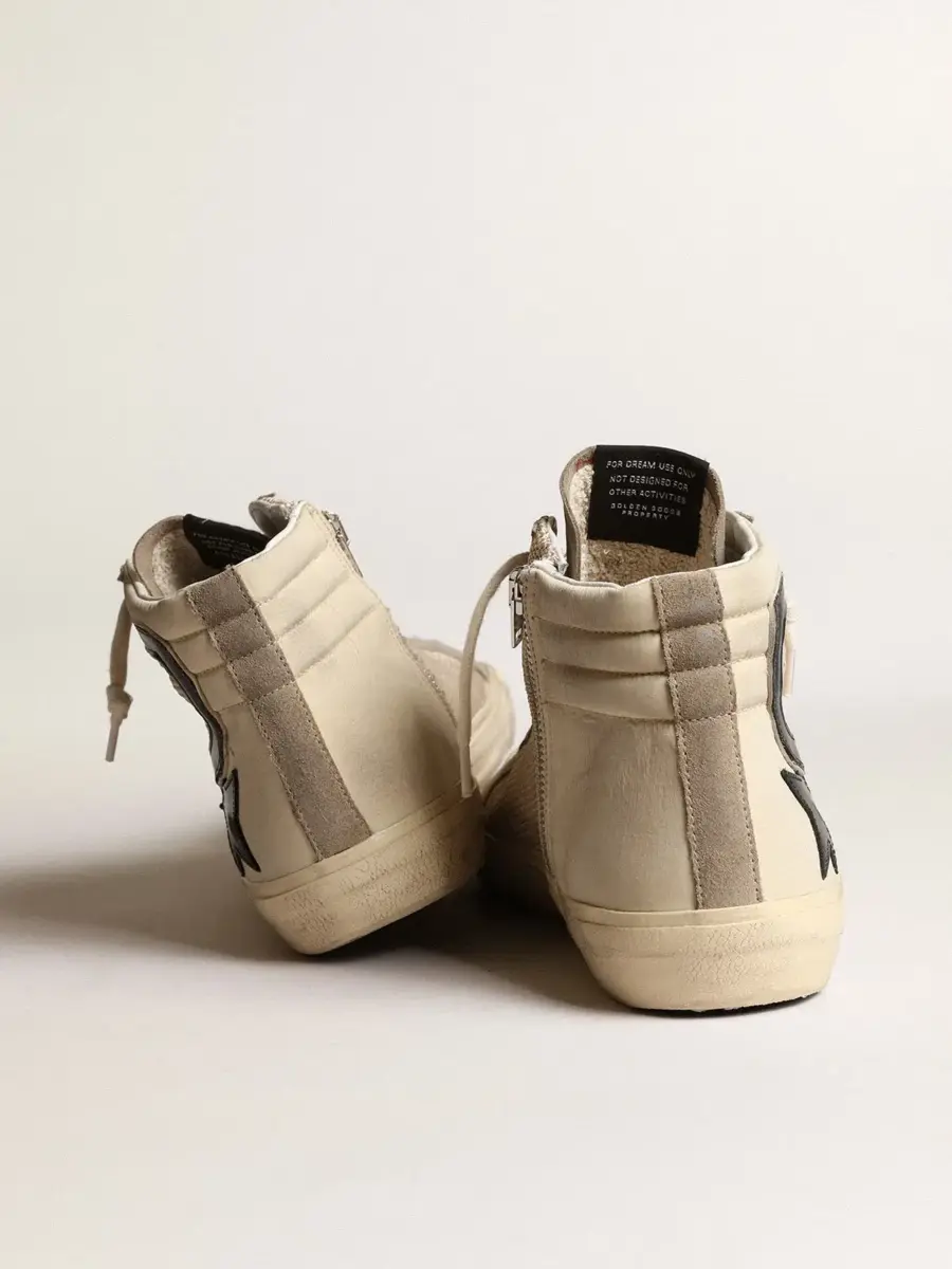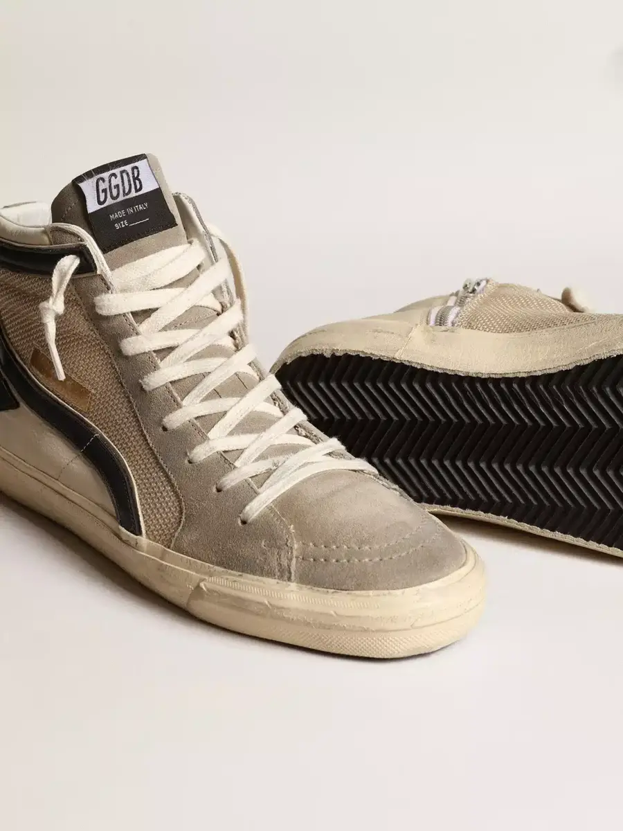 Alma skater, actitud glamurosa. Nuestras zapatillas Slide te transportan directamente a Venice Beach, entre un ollie y un kickflip. Este modelo con parte superior de malla beige y nailon presenta detalles en piel azul medianoche brillante, como la estrella y el rayo. La lengüeta y las inserciones de ante gris paloma y los cordones de color crema añaden el toque final.