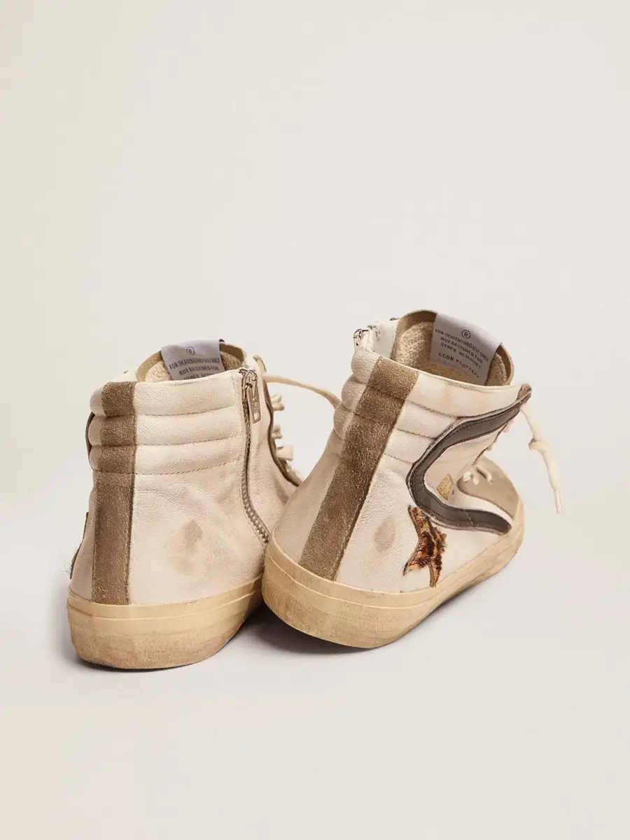 Alma skater, actitud glamurosa. Nuestras zapatillas Slide te transportan directamente a Venice Beach, entre un ollie y un kickflip. Este modelo, con una parte superior de piel napa blanca acentuada por el detalle de piel negra con ribete de piel laminada plateada, presenta una estrella de piel de potro con estampado de leopardo y lengüeta e inserciones de ante gris paloma. Y los cordones blancos añaden el toque final.