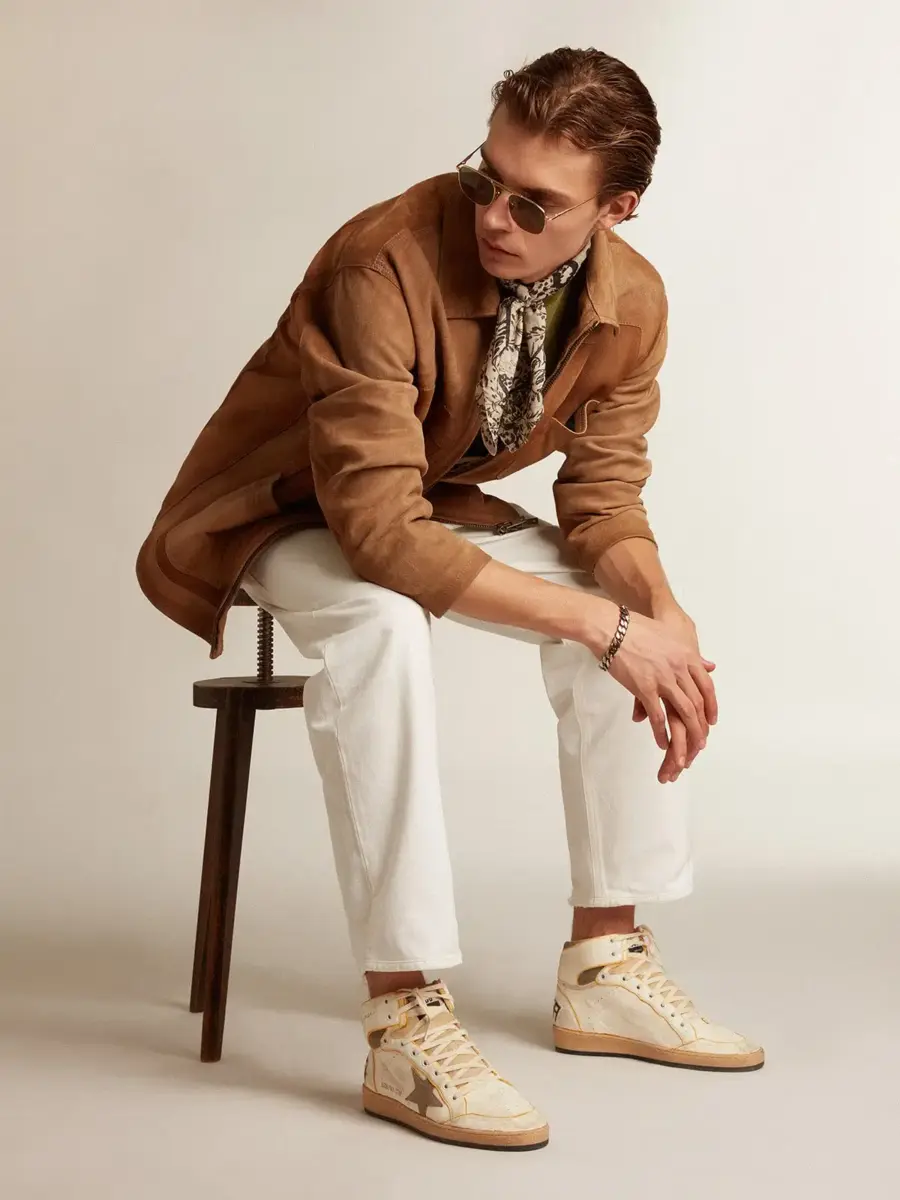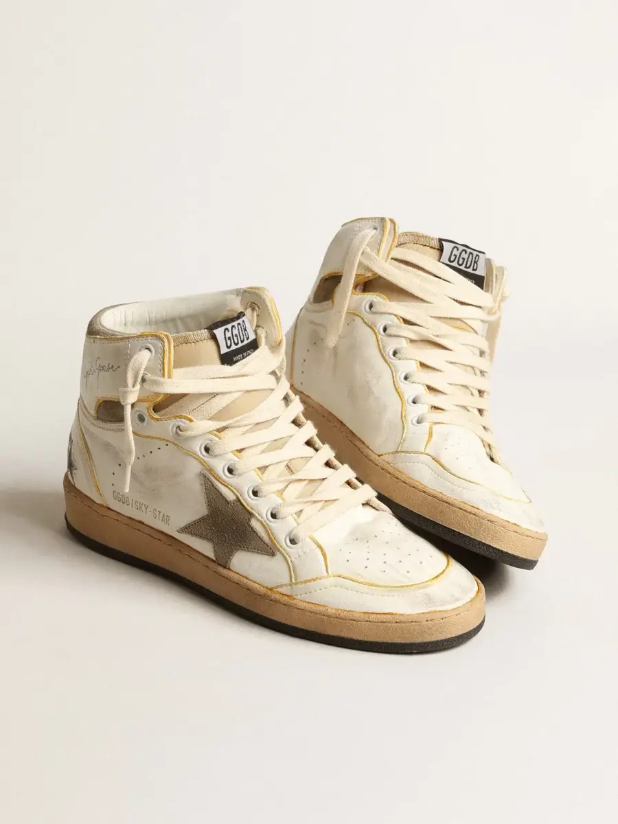 Una reinterpretación de las zapatillas de caña alta con un alma auténtica: inspiradas en nuestro modelo Ball Star, nuestras zapatillas Sky-Star tienen un aire universitario americano y recuerdan al baloncesto de los años ochenta. Este modelo para hombre, con una parte superior de piel napa blanca con efecto amarillento, presenta una estrella de ante gris paloma y la firma Golden Goose en el cuello del tobillo, una referencia al sueño infantil de que tus zapatillas favoritas las firmen leyendas del baloncesto. La lengüeta de nailon beige y los cordones beige completan el look.