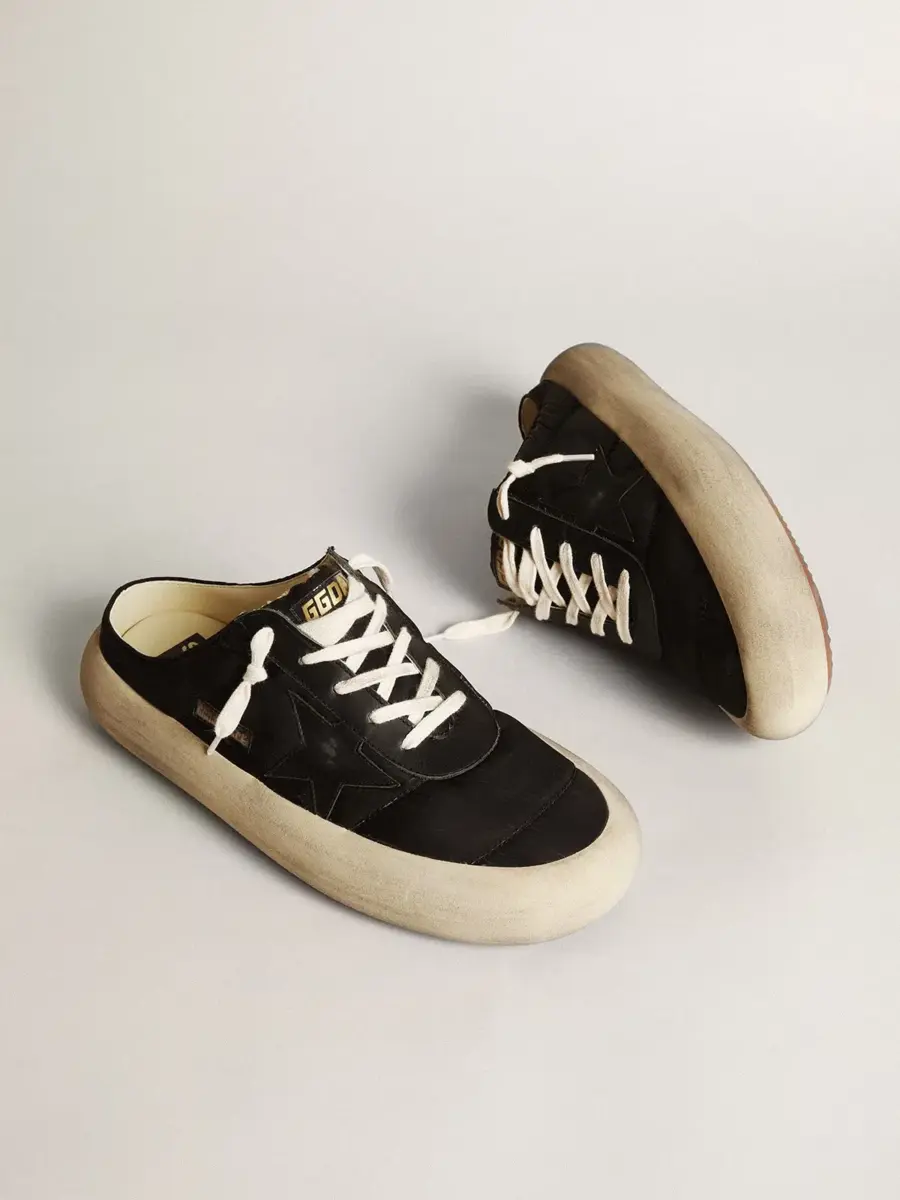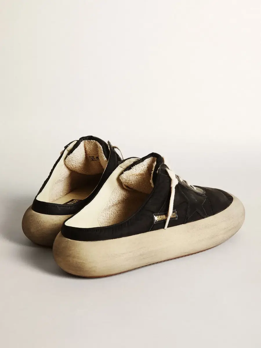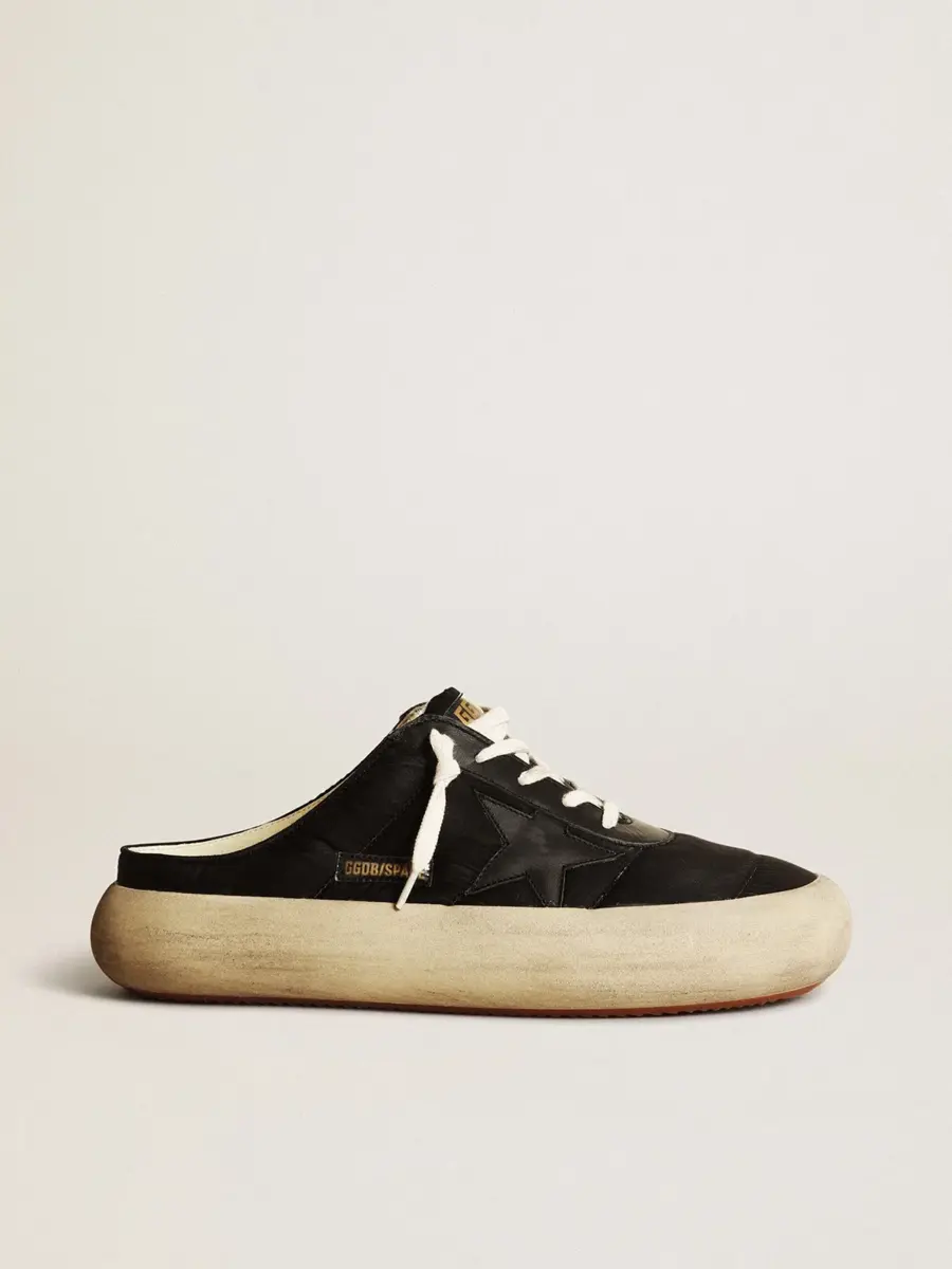 Tu nuevo momento para desconectar de la realidad y volar como nunca antes. Envuelto en esa increíble sensación de ligereza desde el primer segundo, dejando espacio para la versión más audaz de ti mismo. Por fin liberas tu estilo y vacías tu mente. Las zapatillas Space-Star cuentan con una suela extra acolchada y una plantilla rellena de espuma viscoelástica, lo que garantiza una comodidad sin igual desde el primer paso. Esta versión de sabots para hombre presenta una parte superior de nailon negro acentuada con inserciones de cuero negro, incluida la estrella, y un forro de cuero suave. Los cordones de color crema completan el look.