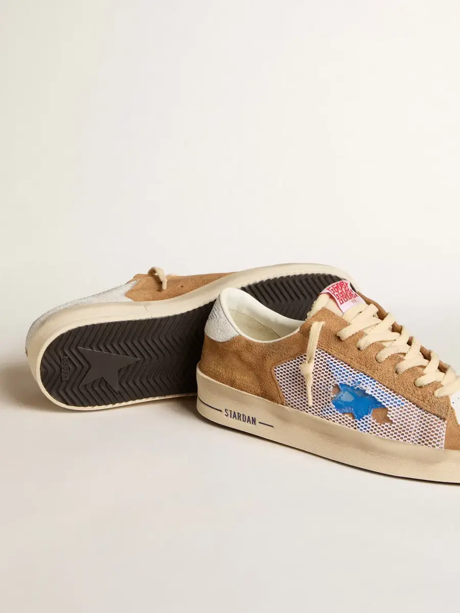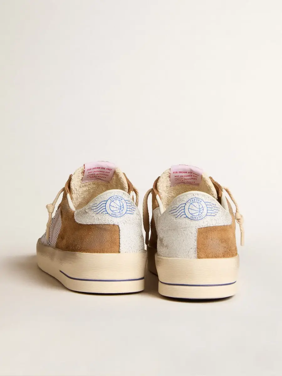 Los gloriosos años noventa plasmados en unas zapatillas. Las zapatillas Stardan rinden homenaje a los iconos del baloncesto de esa década, sin perder de vista el presente. En esta versión, la parte superior de ante color tabaco con inserciones de malla blanca presenta una estrella de cuero azul y una lengüeta y puntera de cuero craquelado blanco. La lengüeta de nailon beige y los cordones beige añaden el toque final.
