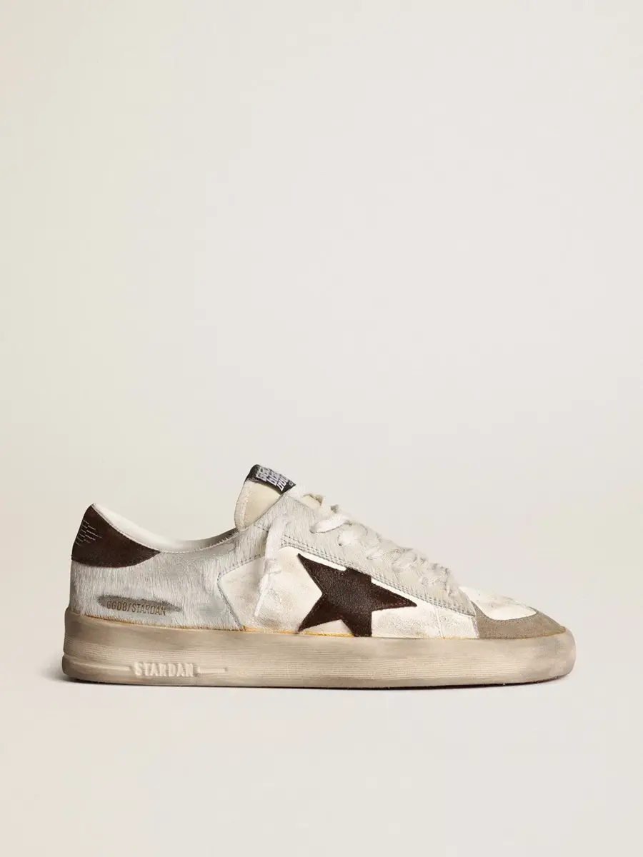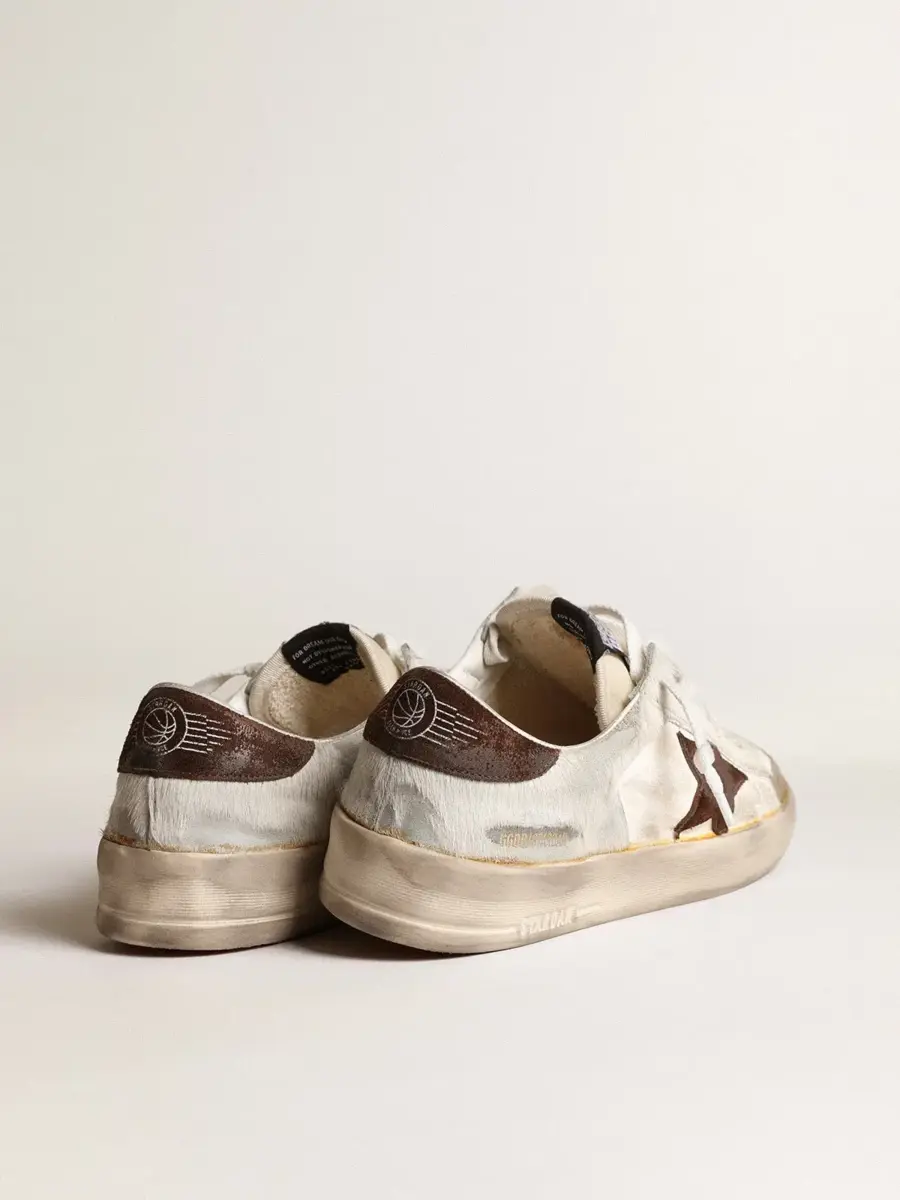 Los gloriosos años noventa plasmados en unas zapatillas. Las zapatillas Stardan rinden homenaje a los iconos del baloncesto de esa década, sin perder de vista el presente. En esta versión para hombre, la parte superior de piel napa color crema, realzada con inserciones de piel de potro blanca, presenta una estrella de ante marrón y una lengüeta en el talón. La puntera de ante gris paloma y los cordones blancos añaden el toque final.