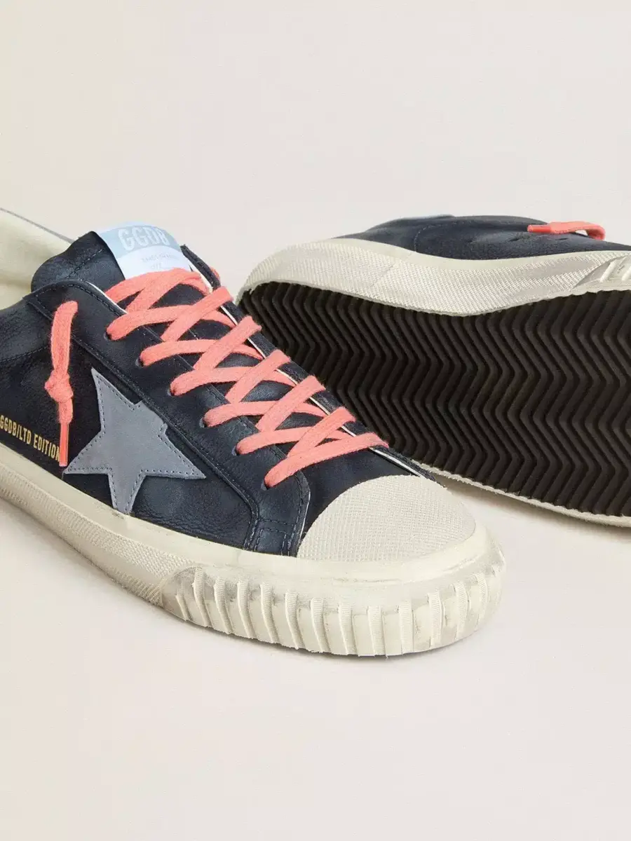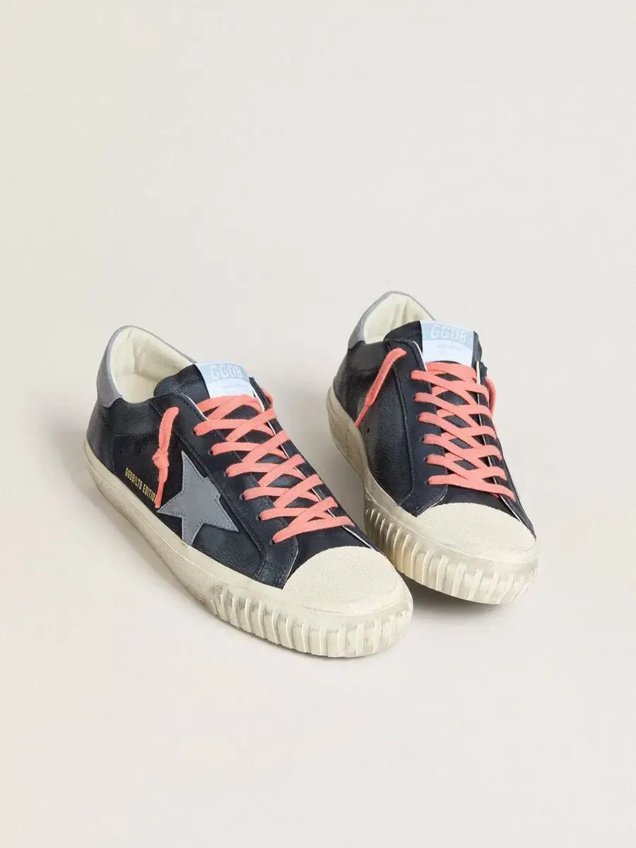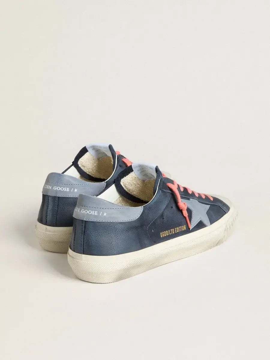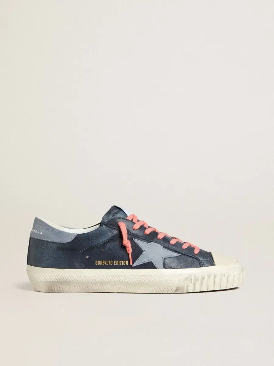 Un icono atemporal, pero en constante evolución. En Golden, nos encanta tomar nuestros clásicos y reelaborarlos constantemente, siempre desde un nuevo ángulo. Estas Super-Star con parte superior de cuero azul marino cuentan con una estrella y una lengüeta en el talón de cuero nobuk azul claro. Y los cordones rosas añaden el toque final.