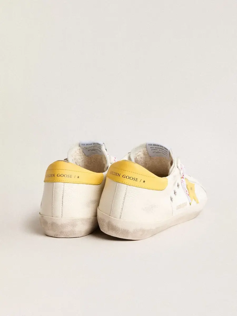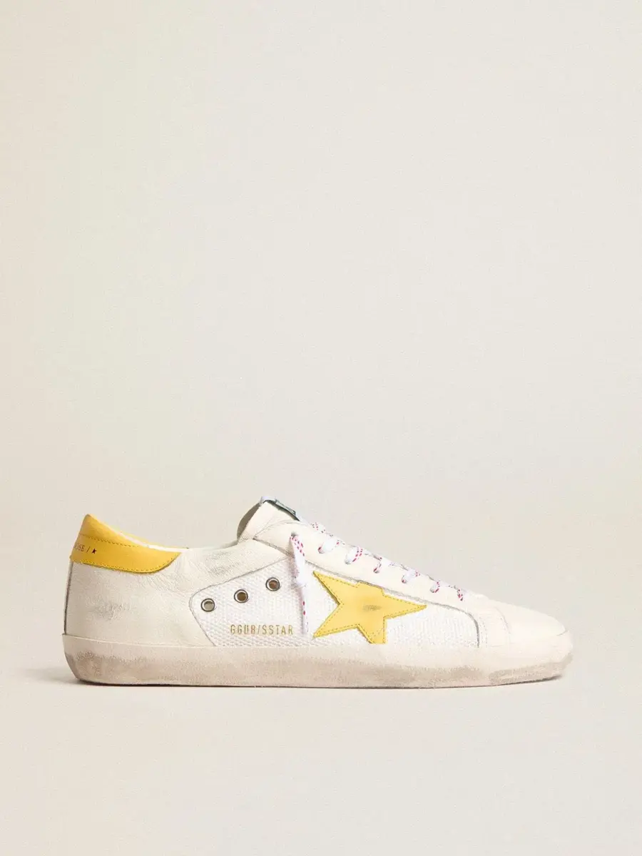 Un icono atemporal, pero en constante evolución. En Golden, nos encanta retomar nuestros clásicos y reelaborarlos constantemente, siempre desde un nuevo ángulo. Con una parte superior de malla y piel napa en color blanco envejecido, estas Super-Star para hombre cuentan con una estrella de piel amarilla y una lengüeta en el talón. Los cordones blancos con un patrón de rayas rojas añaden el toque final.