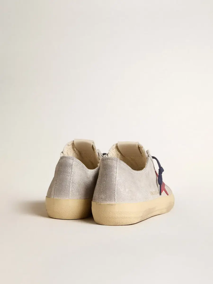 La belleza reside en la simplicidad: en nuestras zapatillas V-Star, una forma esencial se combina con detalles elegantes. Este modelo para hombre con parte superior de ante metalizado plateado cuenta con una estrella de ante rojo. La puntera de goma beige y los cordones azules le dan el toque final.