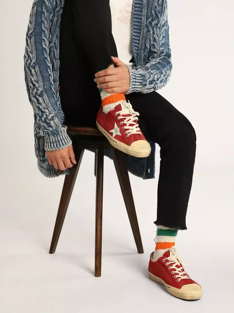 La belleza reside en la simplicidad: en nuestras zapatillas V-Star, una forma esencial se combina con detalles elegantes. La parte superior de ante rojo oscuro de este modelo cuenta con una estrella y una lengüeta en el talón de cuero metalizado plateado. Los cordones beige natural añaden un toque final elegante.