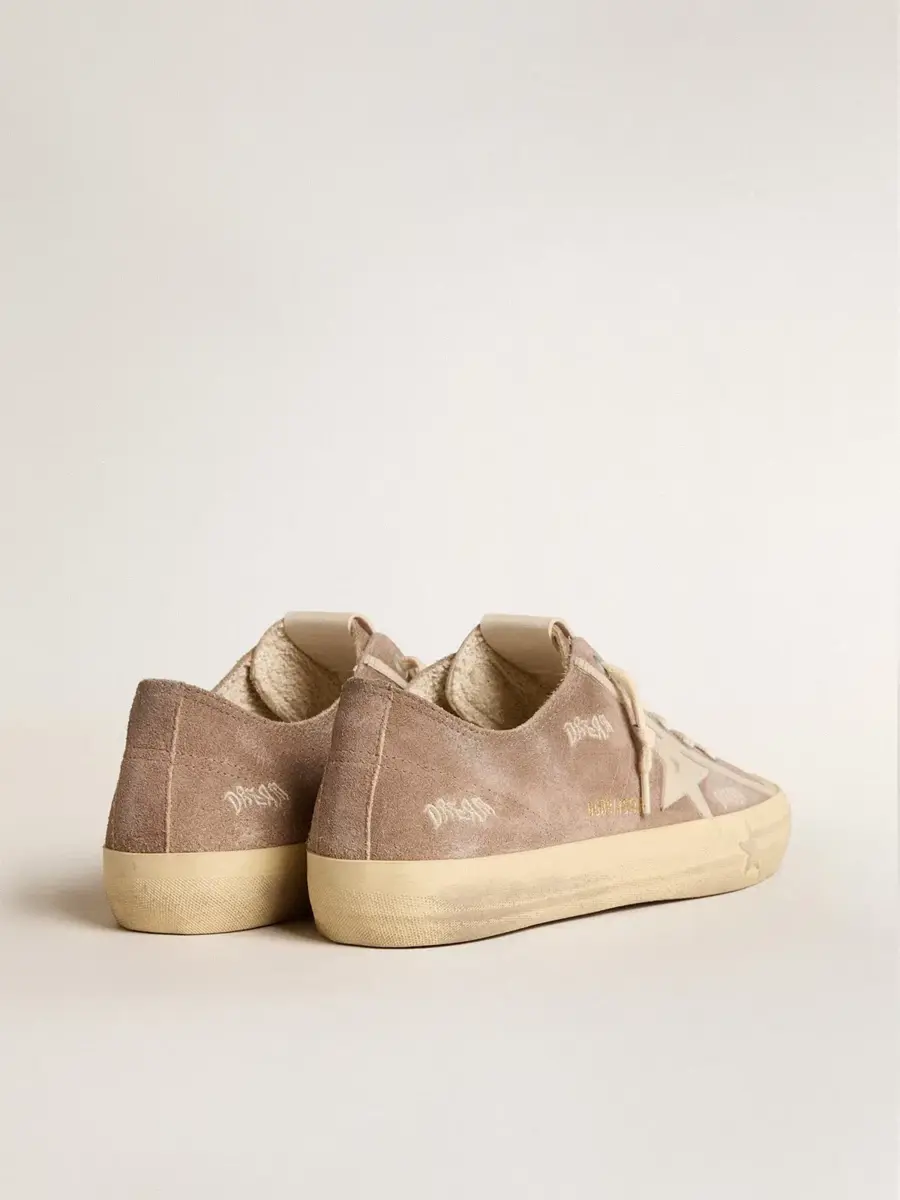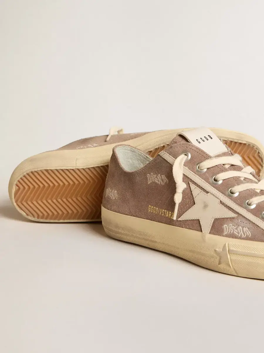 - Parte superior de ante gris paloma con letras bordadas por toda la superficie