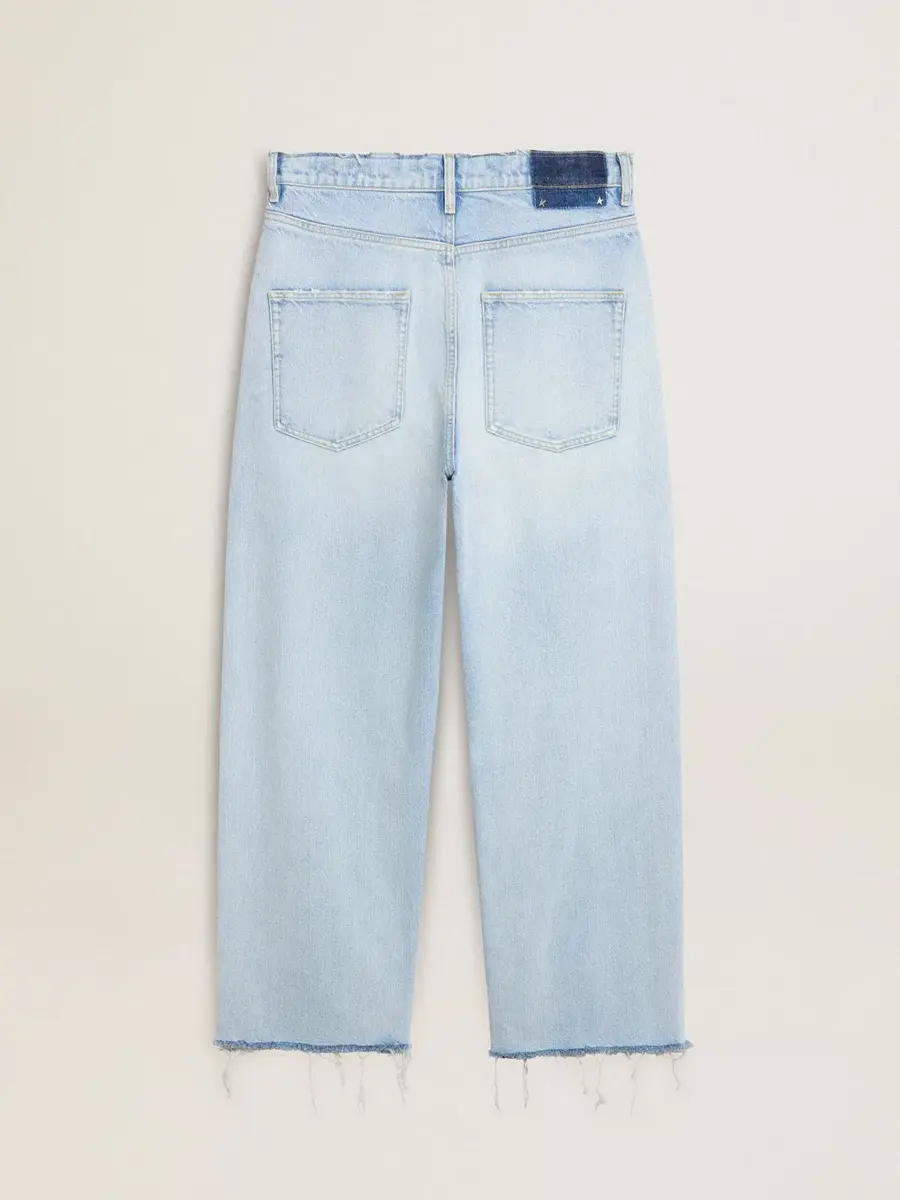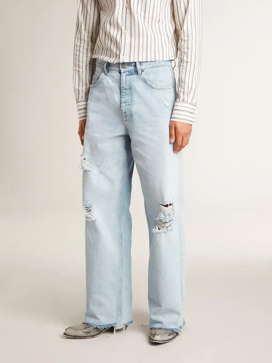 Inspirada en la energía eléctrica de los años noventa, la colección celebra el poder ilimitado de los sueños compartidos. Movidos por la pasión, cada diseño captura el significado de la unión y el poder de la música. Estos pantalones vaqueros con tinte decolorado tienen un corte oversize y rotos que les dan un efecto desgastado. Los cinco bolsillos añaden el toque final.