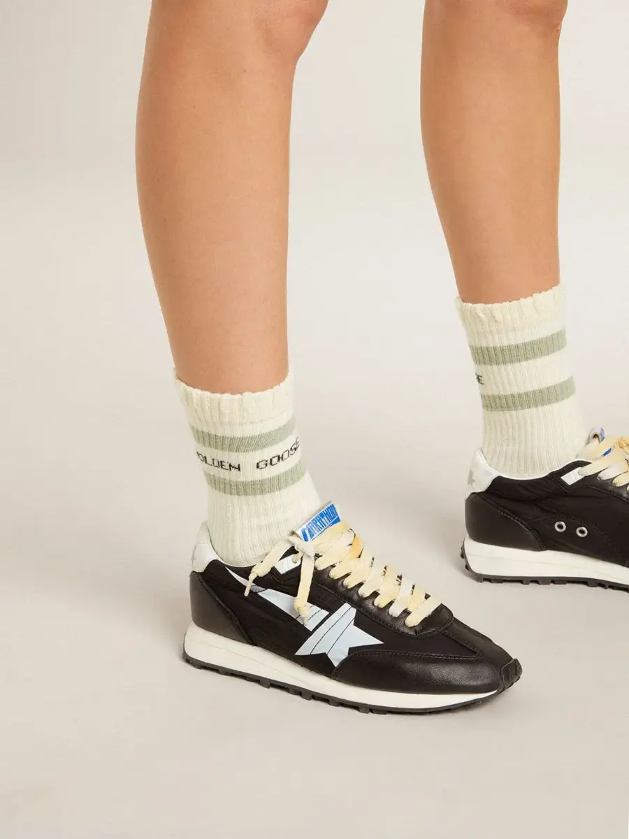 El estilo vintage es uno de nuestros rasgos distintivos: estos calcetines blancos desgastados presentan detalles desgastados en la pierna y dos rayas verde salvia por encima del tobillo.