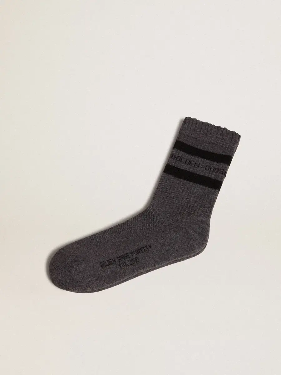 El estilo vintage es uno de nuestros rasgos distintivos: estos calcetines grises presentan detalles desgastados en la pierna y rayas negras tono sobre tono.