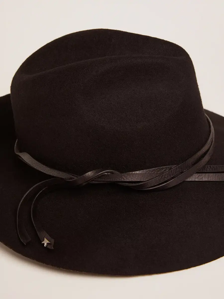 Una colección única y atemporal que engloba la esencia de Golden Goose, diseñada para acompañarte cada día y acompañarte en tus altibajos, llueva o haga sol. Este sombrero Fedora de lana pura negra cuenta con una correa de cuero negro tejido y un tachón con la forma de la icónica estrella dorada. Para siempre, para ti.