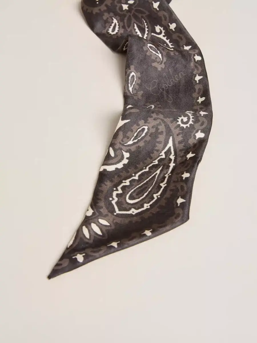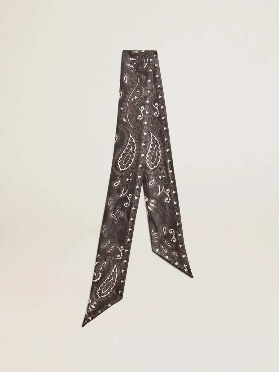 Tu historia se convierte en el accesorio más preciado para llevar contigo y conservar siempre. Confeccionada en seda preciosa, esta cinta negra con estampado de cachemira es el toque dorado que estabas buscando.