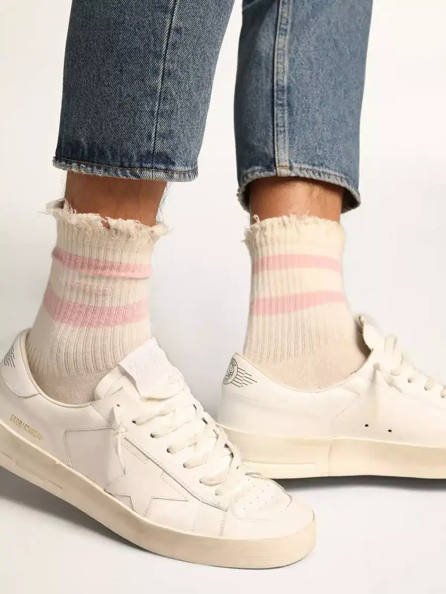 El accesorio imprescindible para un look Golden total. Estos calcetines de color blanco papiro presentan un ribete grueso con acabado desgastado y un logotipo con rayas rosa claro.