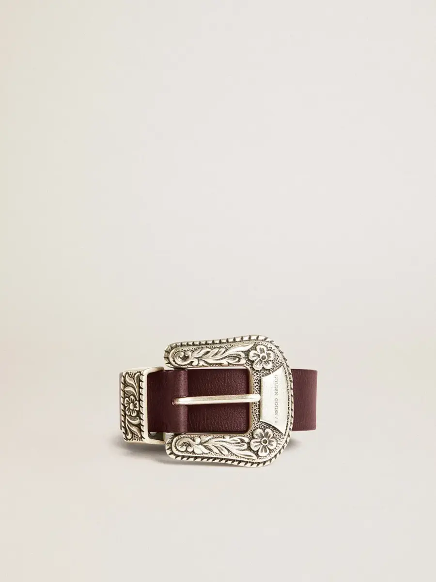 Cuando la sencillez se enriquece con detalles únicos. Este modelo, confeccionado en piel burdeos lavada, cuenta con una hebilla decorada en color plateado.