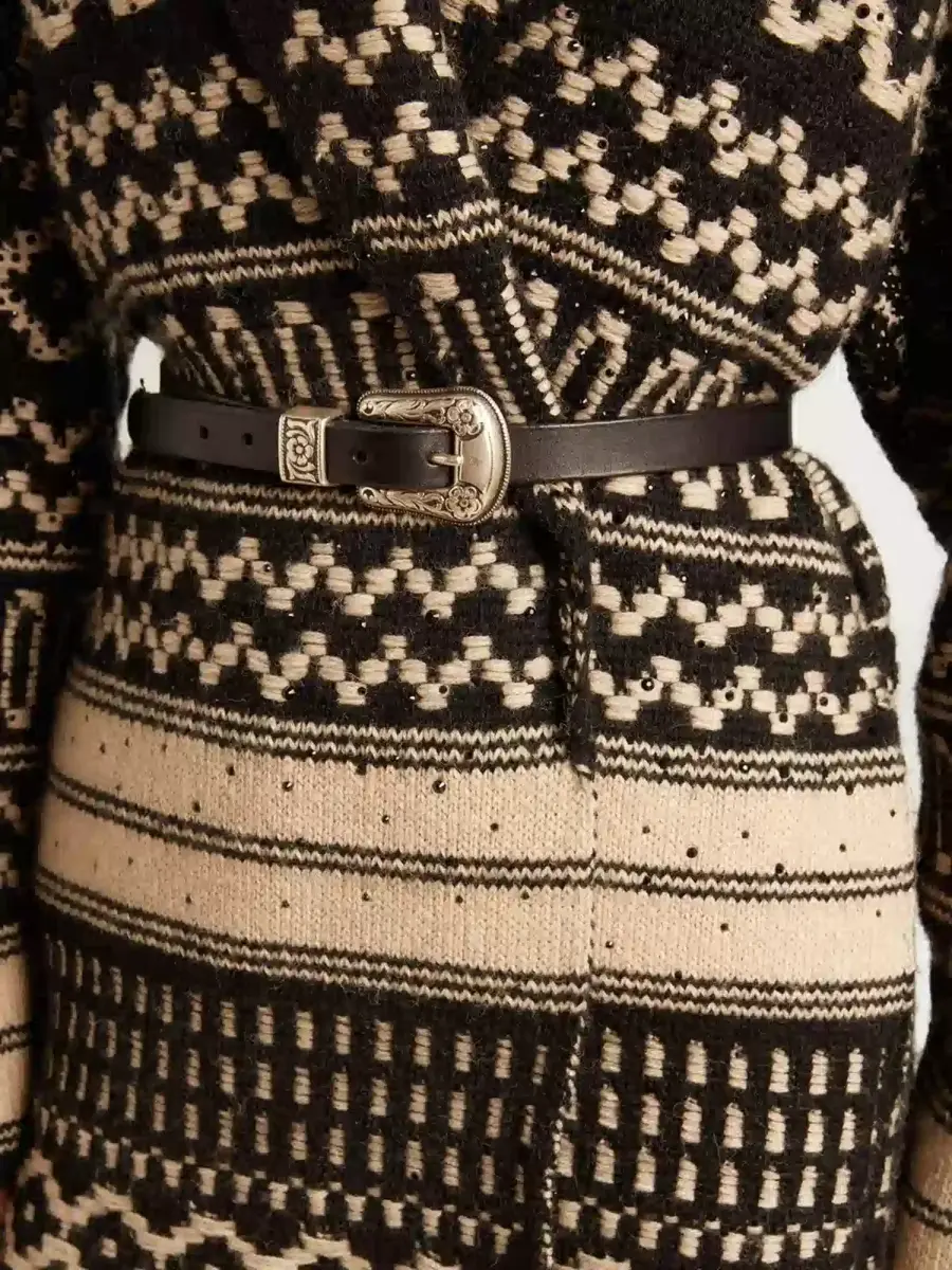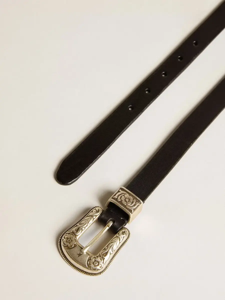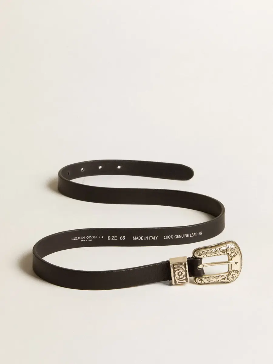 Alma vintage, inspiración del Salvaje Oeste. Este cinturón de cuero lavado negro cuenta con una hebilla decorada en color plateado.
