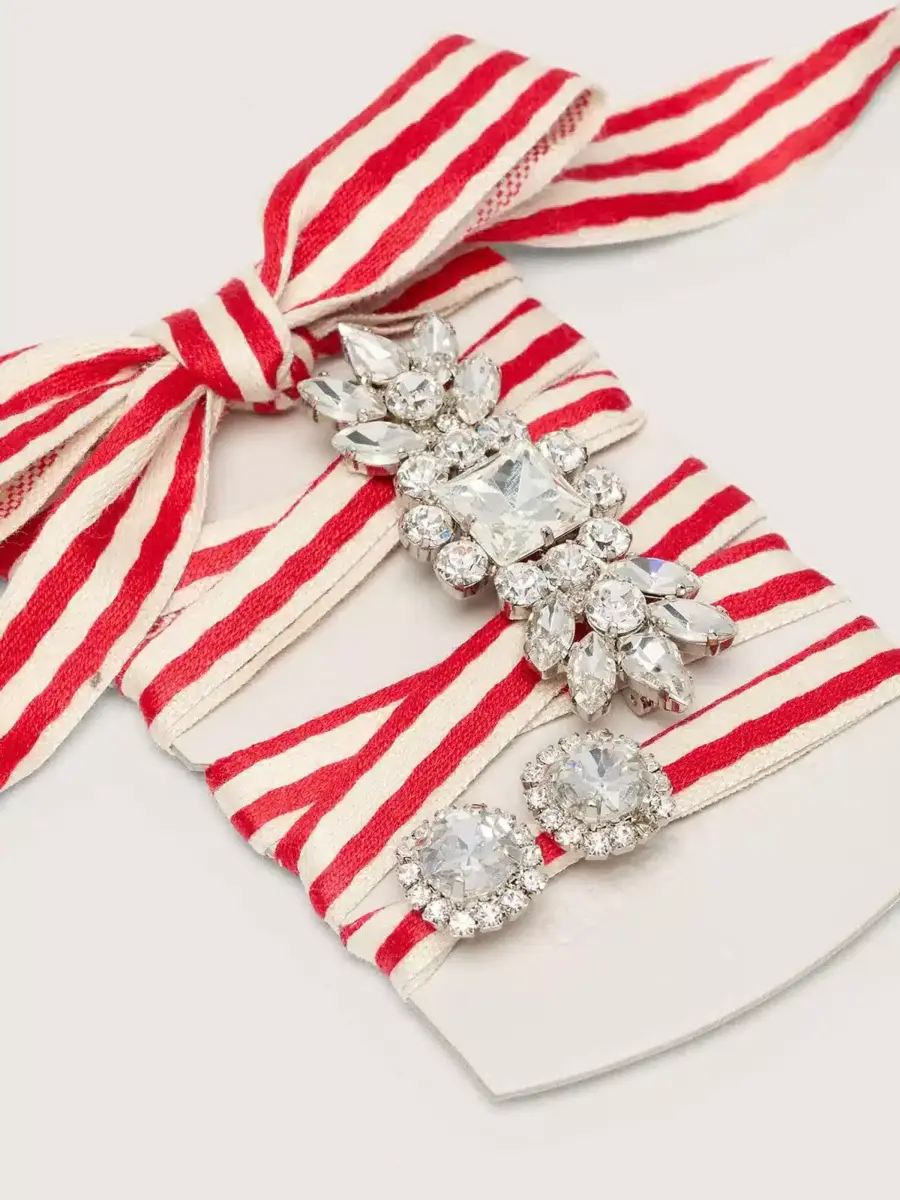 Personaliza tus zapatillas favoritas con «Skins», nuestros cordones decorados, diseñados para expresar tu estilo único a través de accesorios y colores que seguro que impresionarán. Este modelo Playful consiste en un cordón de algodón a rayas rojas y beige, adornado con dos charms brillantes de cristal y latón. El accesorio ideal para dejar que tu personalidad brille.