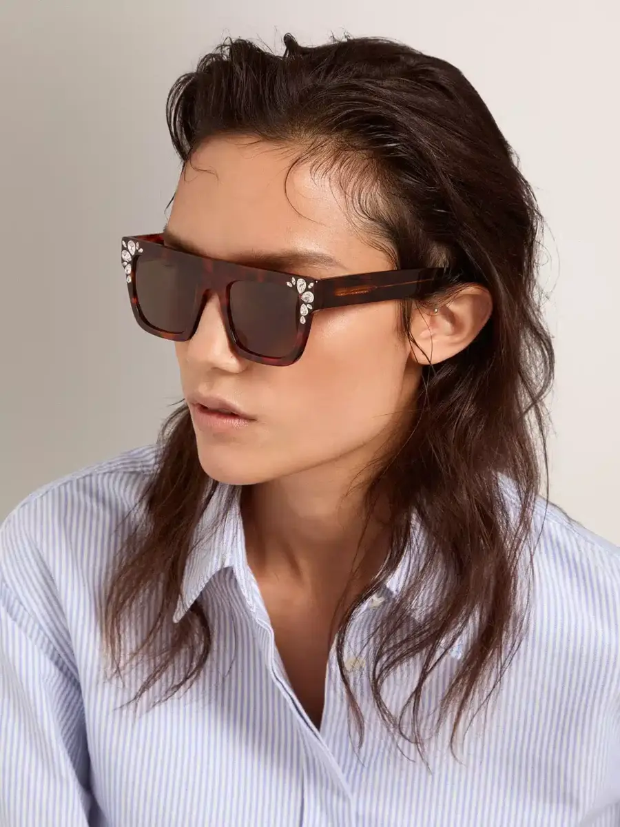 Con su forma cuadrada, estas gafas de sol Jamie se distinguen por su montura marrón habana salpicada de cristales en forma de lágrima en las puntas. Las lentes de color Roviex y los detalles dorados completan el estilo.