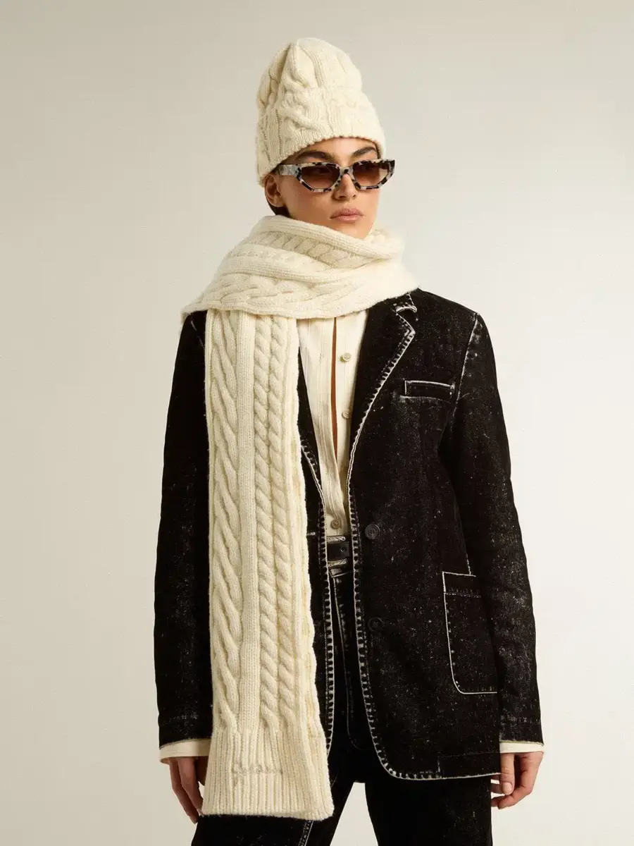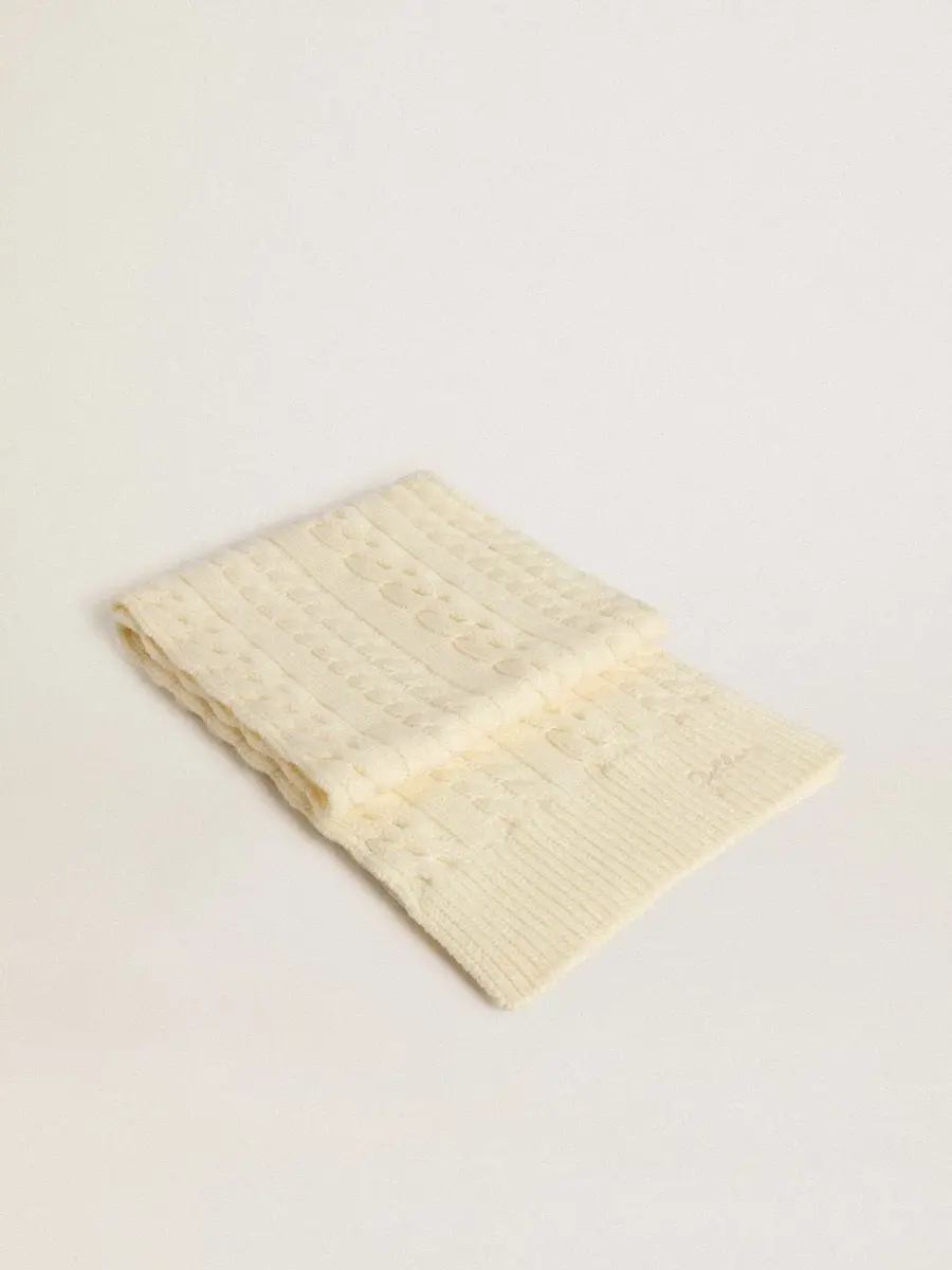 El accesorio imprescindible para un total look Golden, una colección con un alma informal pero una actitud versátil. Esta bufanda blanca de lana pura presenta un patrón tejido y letras del logotipo bordadas tono sobre tono.