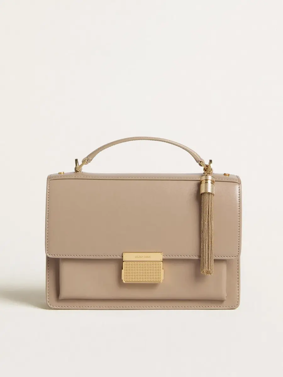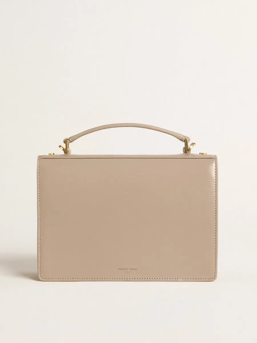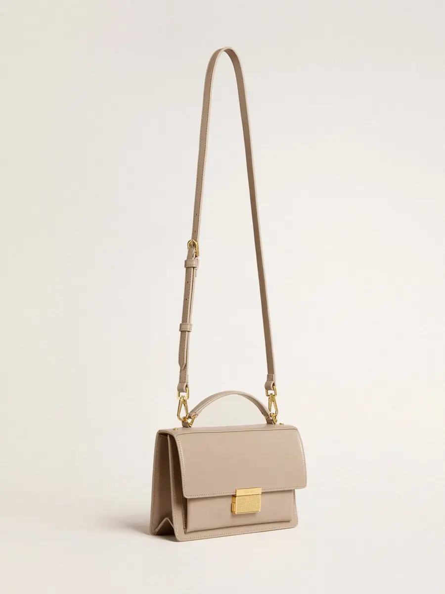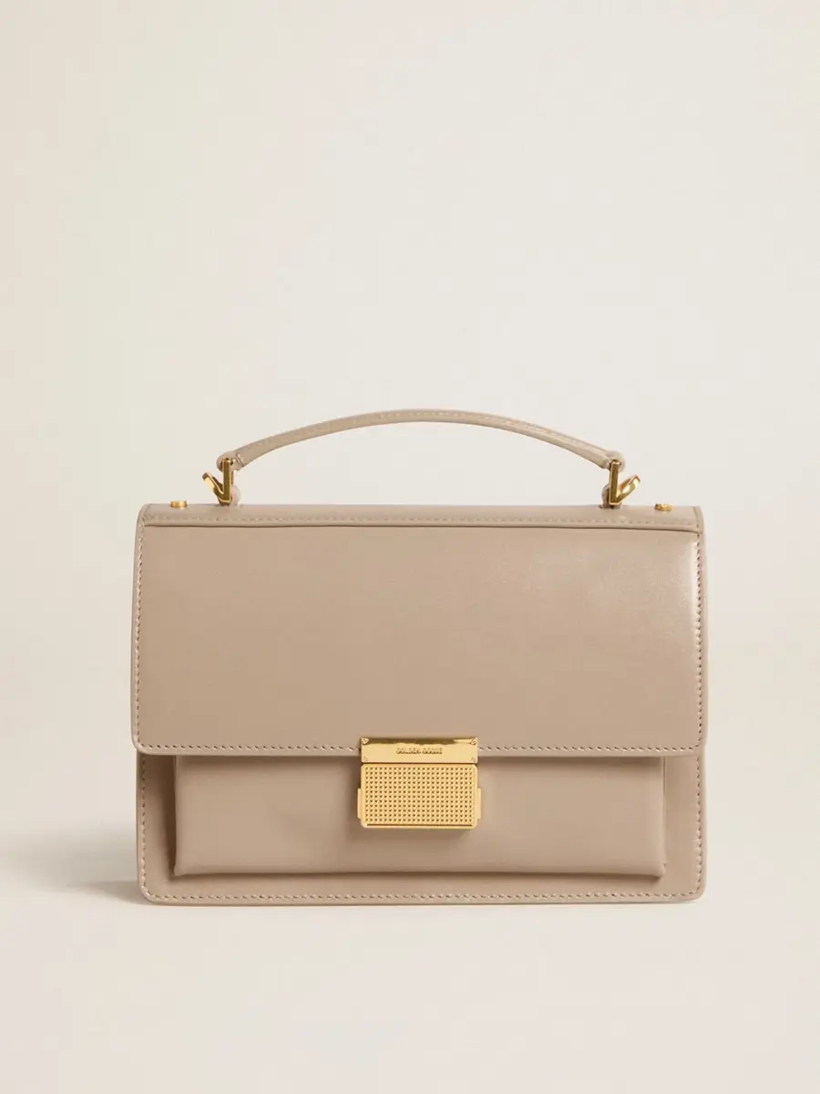 Funcional y sofisticado, nuestro bolso Venezia es una declaración de elegancia veneciana que te invita a llevar un pedazo de su alma allá donde vayas. En piel beige con bordes, este modelo cuenta con un cierre de hebilla dorada y detalles metálicos dorados. El doble bolsillo interior le da el toque final.