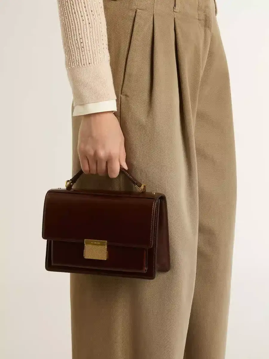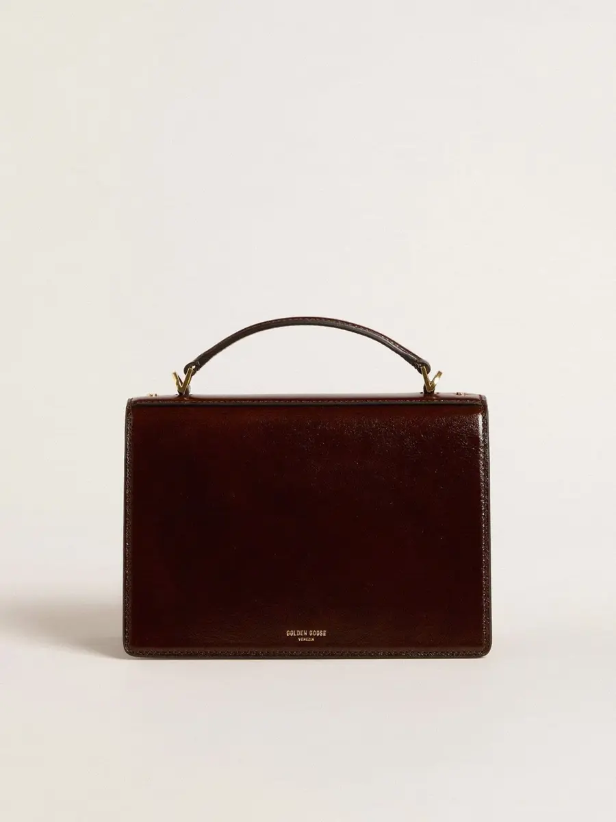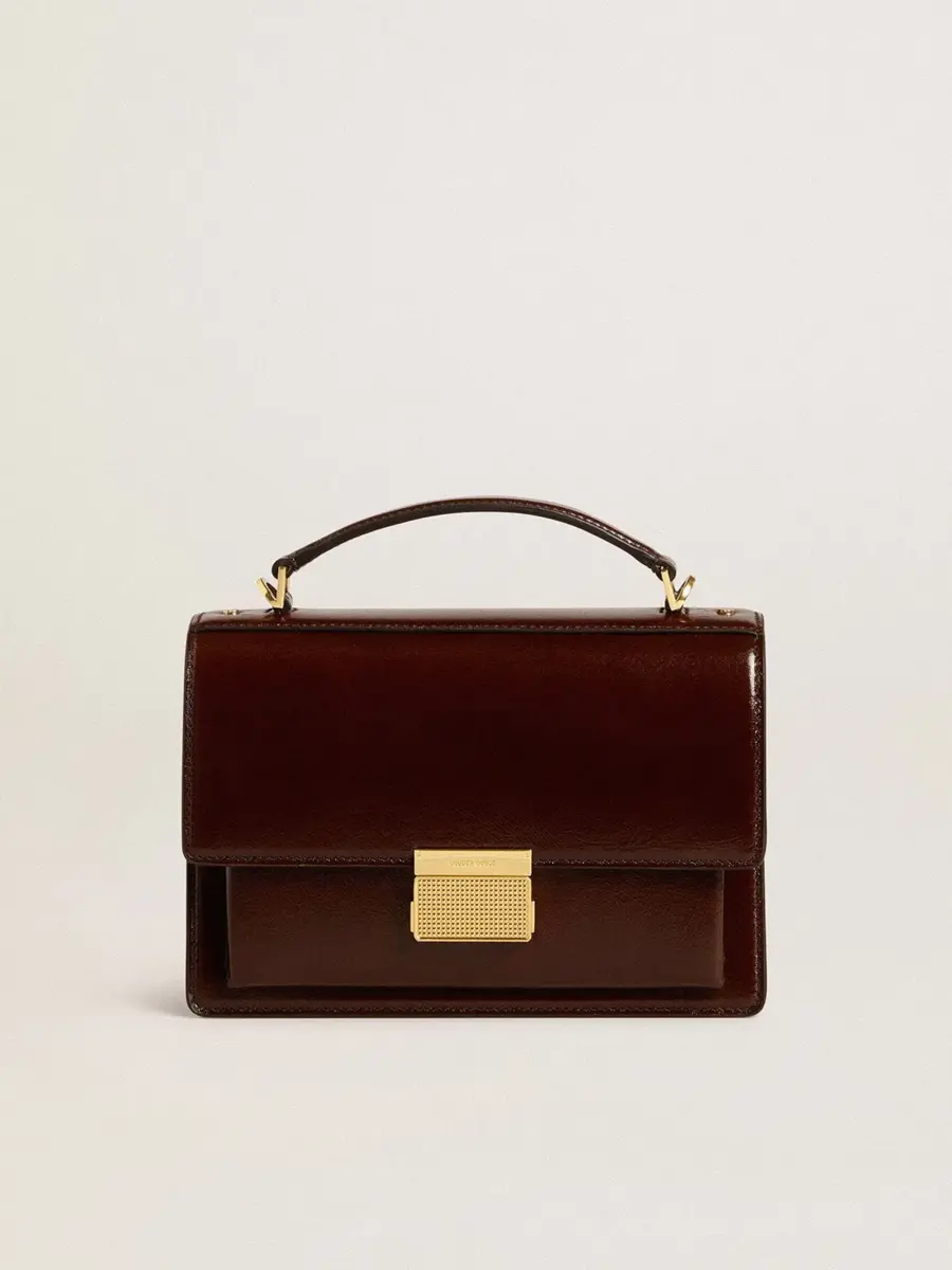 Funcional y sofisticado, nuestro bolso Venezia es una declaración de elegancia veneciana que te invita a llevar un pedazo de su alma allá donde vayas. En piel laminada marrón oscuro, este modelo cuenta con un cierre de hebilla dorada y detalles metálicos dorados. El doble bolsillo interior le da el toque final.