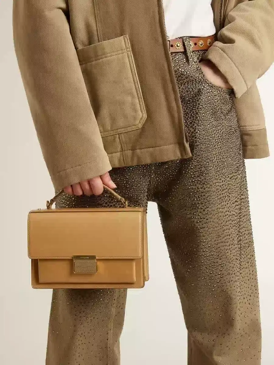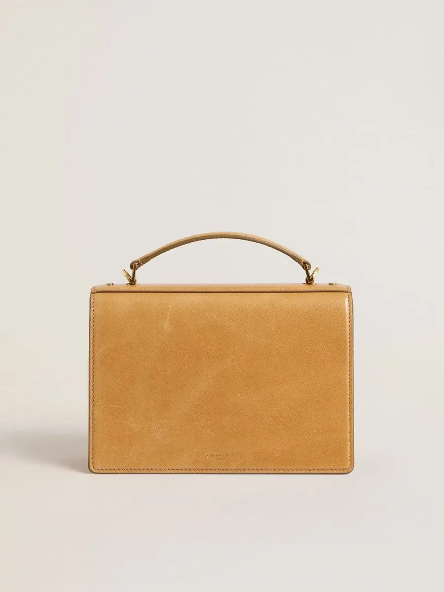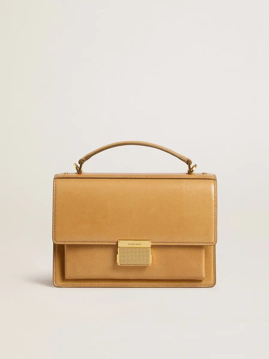Funcional y sofisticado, nuestro bolso Venezia es una declaración de elegancia veneciana que te invita a llevar un pedazo de su alma allá donde vayas. En piel repujada en color amarillo ocre, este modelo cuenta con un cierre de hebilla dorada y detalles metálicos dorados. El doble bolsillo interior le da el toque final.