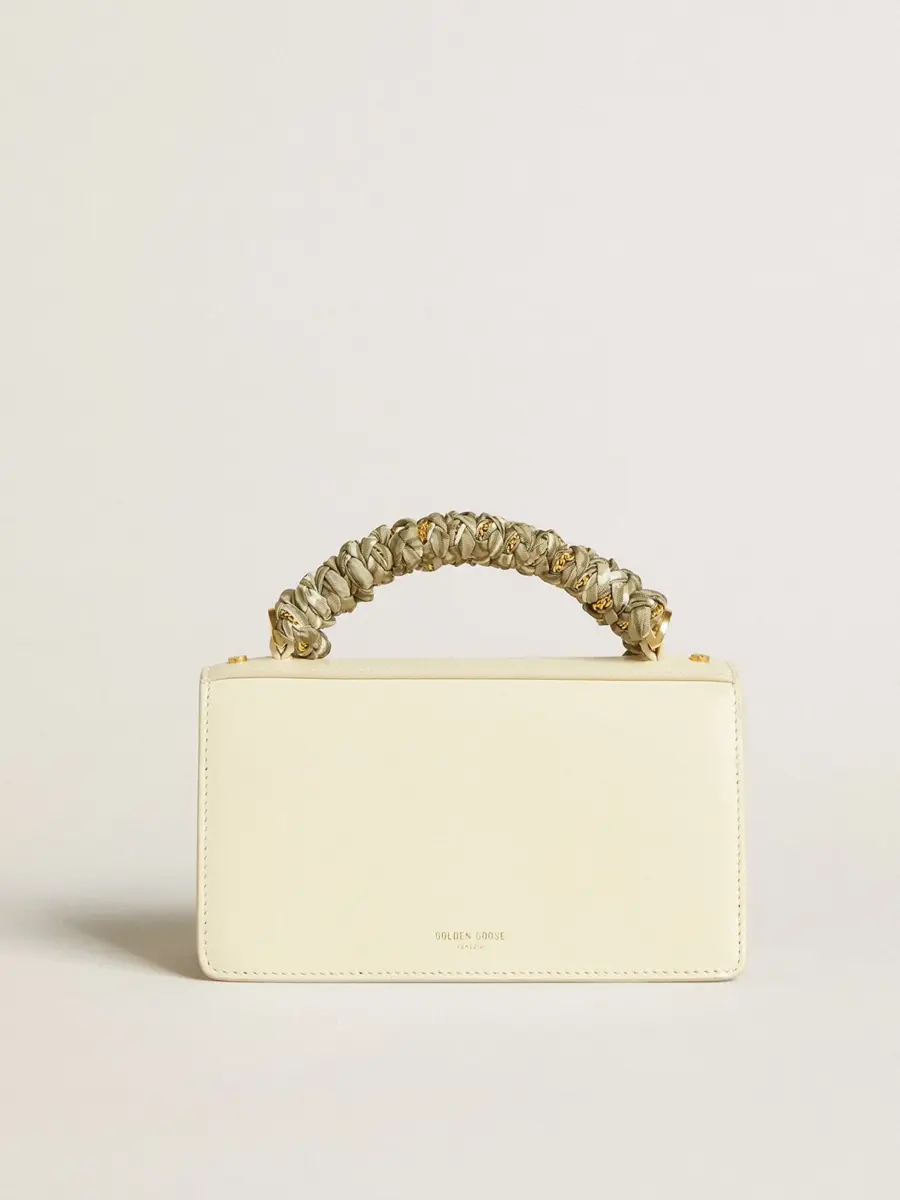 Funcional y sofisticado, nuestro bolso Venezia es una declaración de elegancia veneciana que le invita a llevar consigo un pedazo de su alma allá donde vaya. Confeccionado en piel color mantequilla, esta versión pequeña del bolso cuenta con el detalle único de un pañuelo trenzado en tejido estampado en tonos verde pálido. El doble bolsillo interior y los herrajes dorados le dan el toque final.