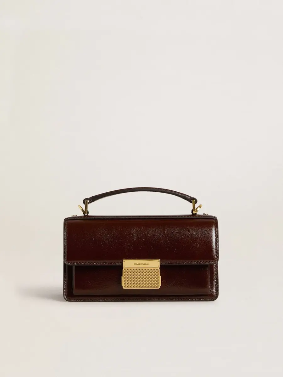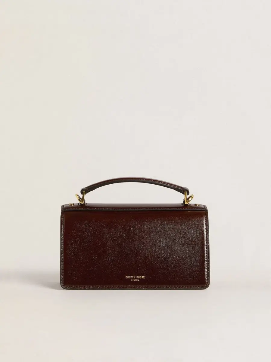Funcional y sofisticado, nuestro bolso Venezia es una declaración de elegancia veneciana que te invita a llevar un pedazo de su alma allá donde vayas. En piel marrón oscuro, la versión pequeña de este modelo cuenta con un cierre de hebilla dorada y detalles metálicos dorados. El doble bolsillo interior le da el toque final.