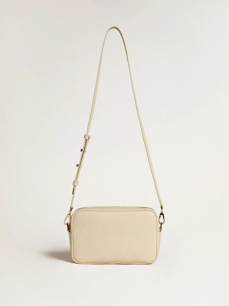 Inspiración vintage, actitud metropolitana. Un accesorio versátil que captura el diseño clásico de las bolsas para cámaras y destaca por sus refinados detalles. Este modelo, en piel martillada color mantequilla, presenta una estrella decorada con cristales Swarovski dorados. El logotipo dorado en contraste en la parte delantera completa el look.