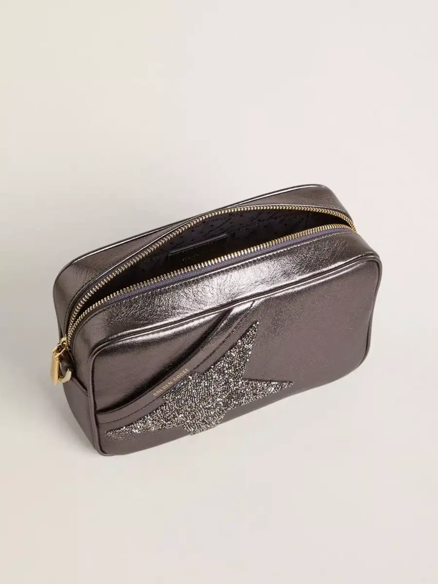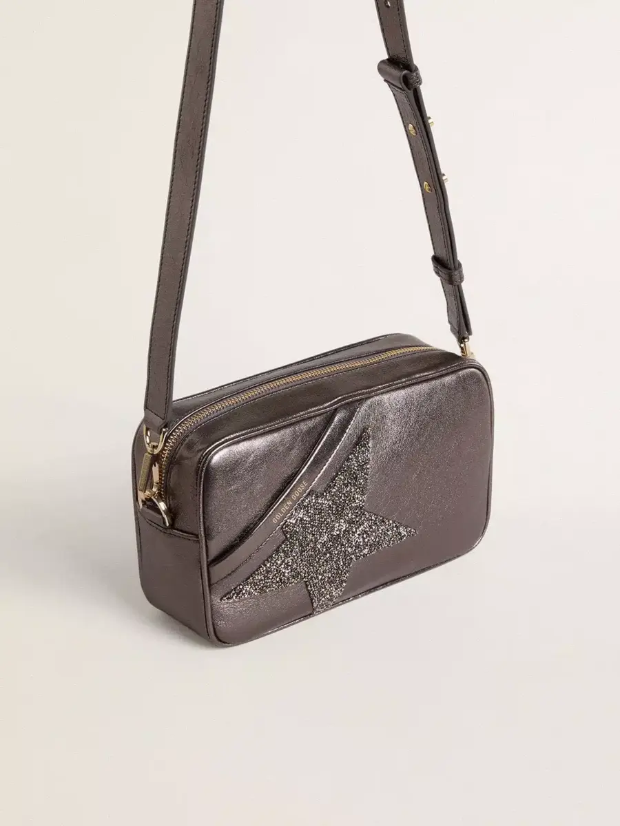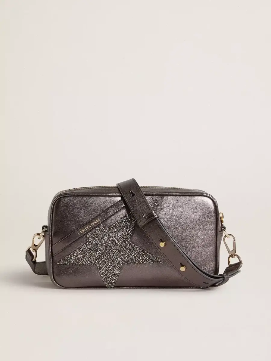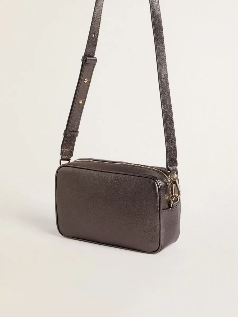Inspiración vintage, actitud metropolitana. Un accesorio versátil que captura el diseño clásico de los bolsos para cámaras y destaca por sus refinados detalles. Este modelo, confeccionado en piel metalizada gris antracita, cuenta con un bolsillo para el teléfono y el logotipo Golden Goose en letras doradas en la parte delantera.