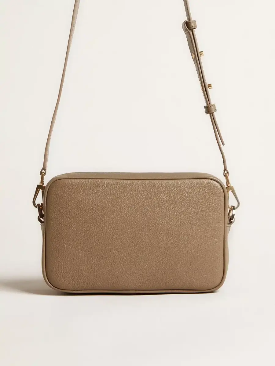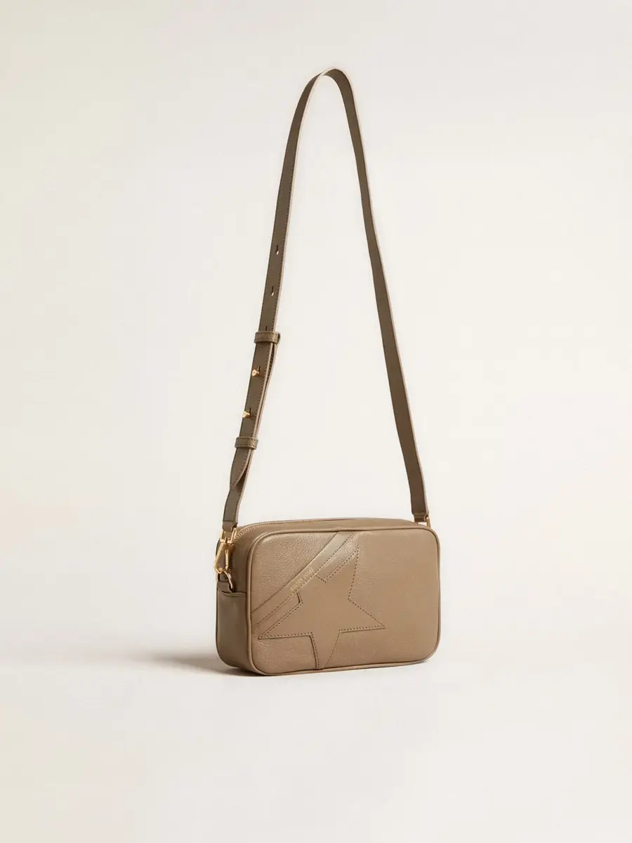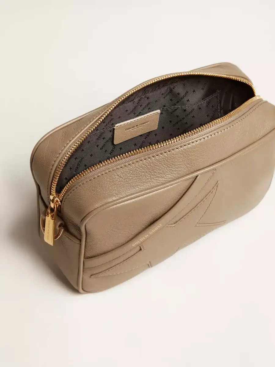 Inspiración vintage, actitud metropolitana. Un accesorio versátil que captura el diseño clásico de las bolsas para cámaras y destaca gracias a sus refinados detalles. Este modelo en piel verde salvia presenta una estrella tono sobre tono. El logotipo dorado en contraste que decora la parte delantera completa el look.