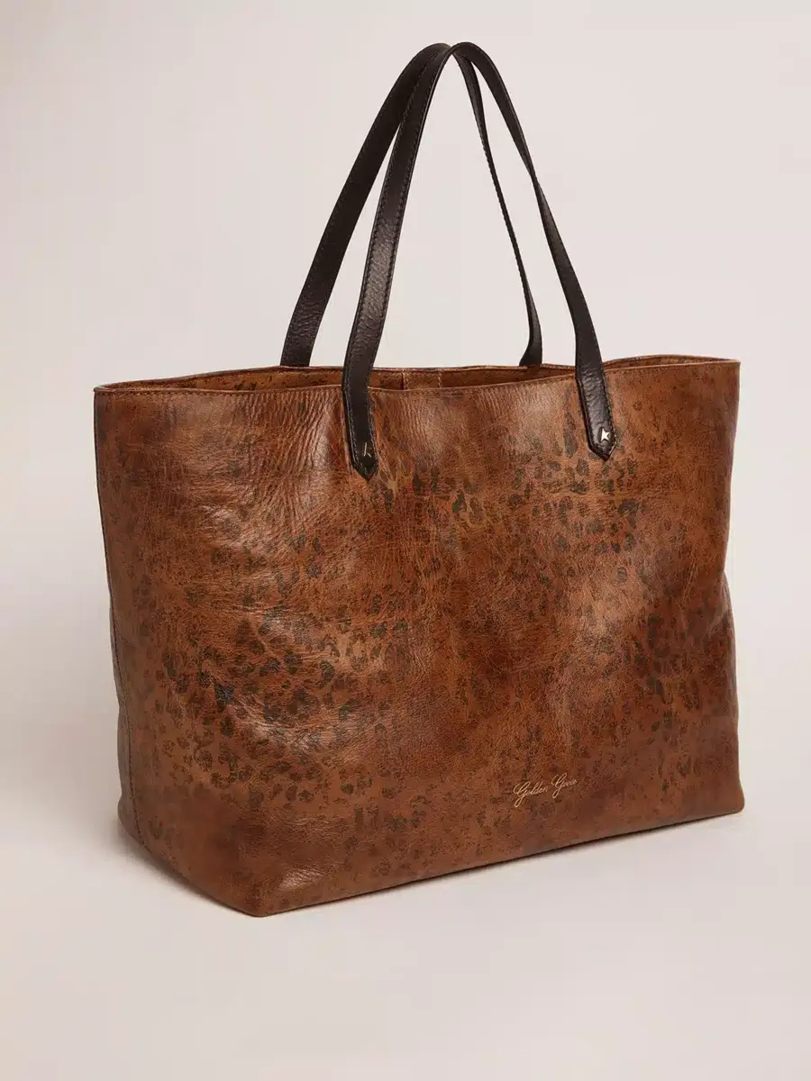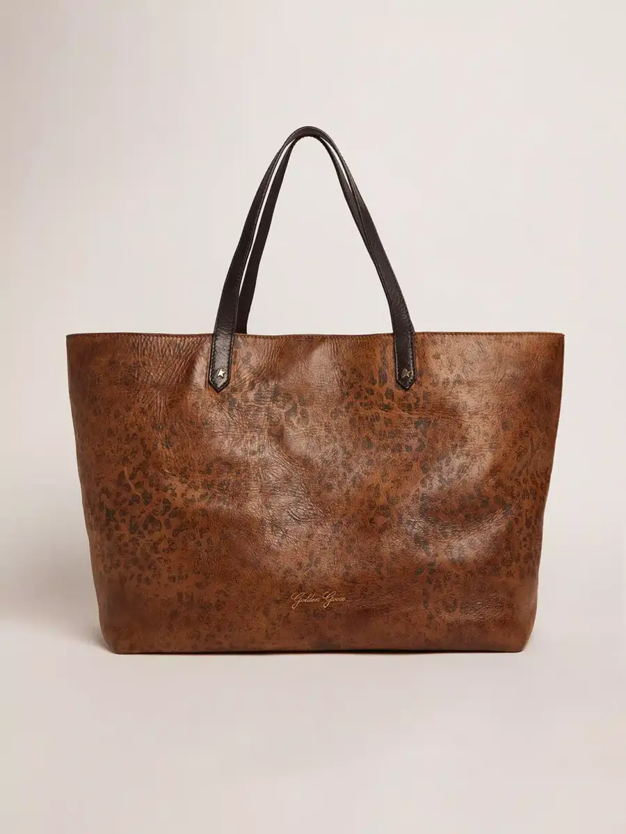 Un diario en el que escribir tu propia historia, tu compañero para las experiencias y aventuras cotidianas. Fabricado en Italia con pieles de alta calidad, nuestro bolso Pasadena vive y evoluciona contigo. Mediante un antiguo proceso de curtido vegetal, este acabado no contiene sustancias químicas y conserva el aspecto natural de la piel, lo que hace que cada bolso sea diferente del resto y simplemente único. Esta versión en piel martillada presenta un estampado de leopardo y asas dobles negras en contraste, decoradas con la icónica estrella dorada. El logotipo dorado en la parte delantera completa el look.