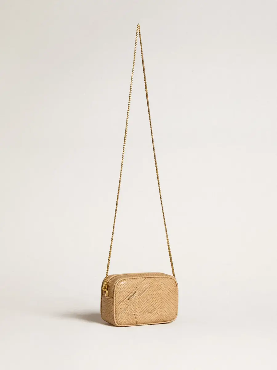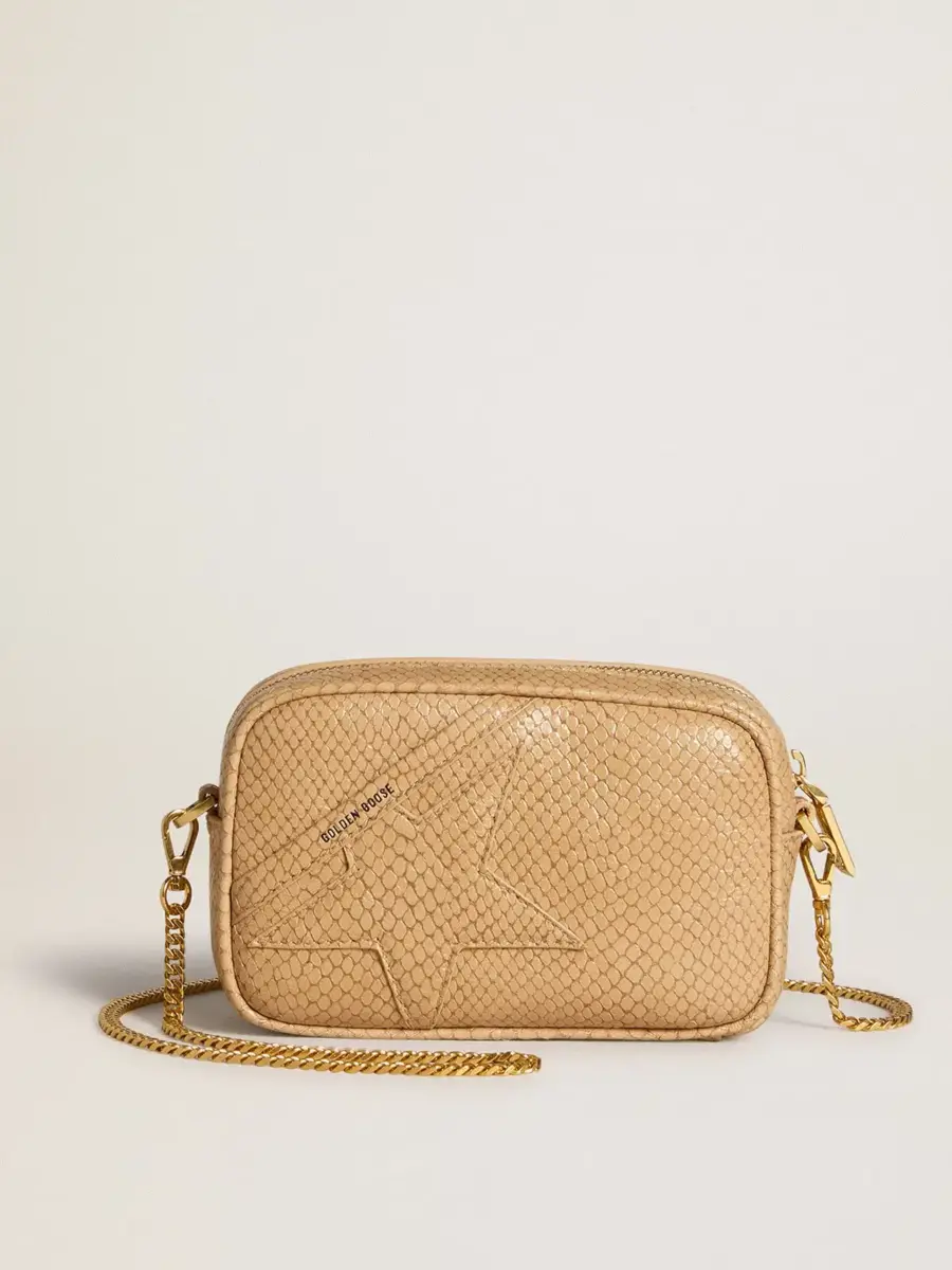 Inspiración vintage, actitud metropolitana. Un accesorio versátil que captura el diseño clásico de los bolsos tipo cámara y destaca por sus refinados detalles, ahora también en versión mini. Este modelo, en piel con estampado de serpiente en color beige, presenta una estrella tono sobre tono en piel martillada. La cadena dorada para el hombro y el logotipo negro en contraste que decora la parte delantera completan el look.