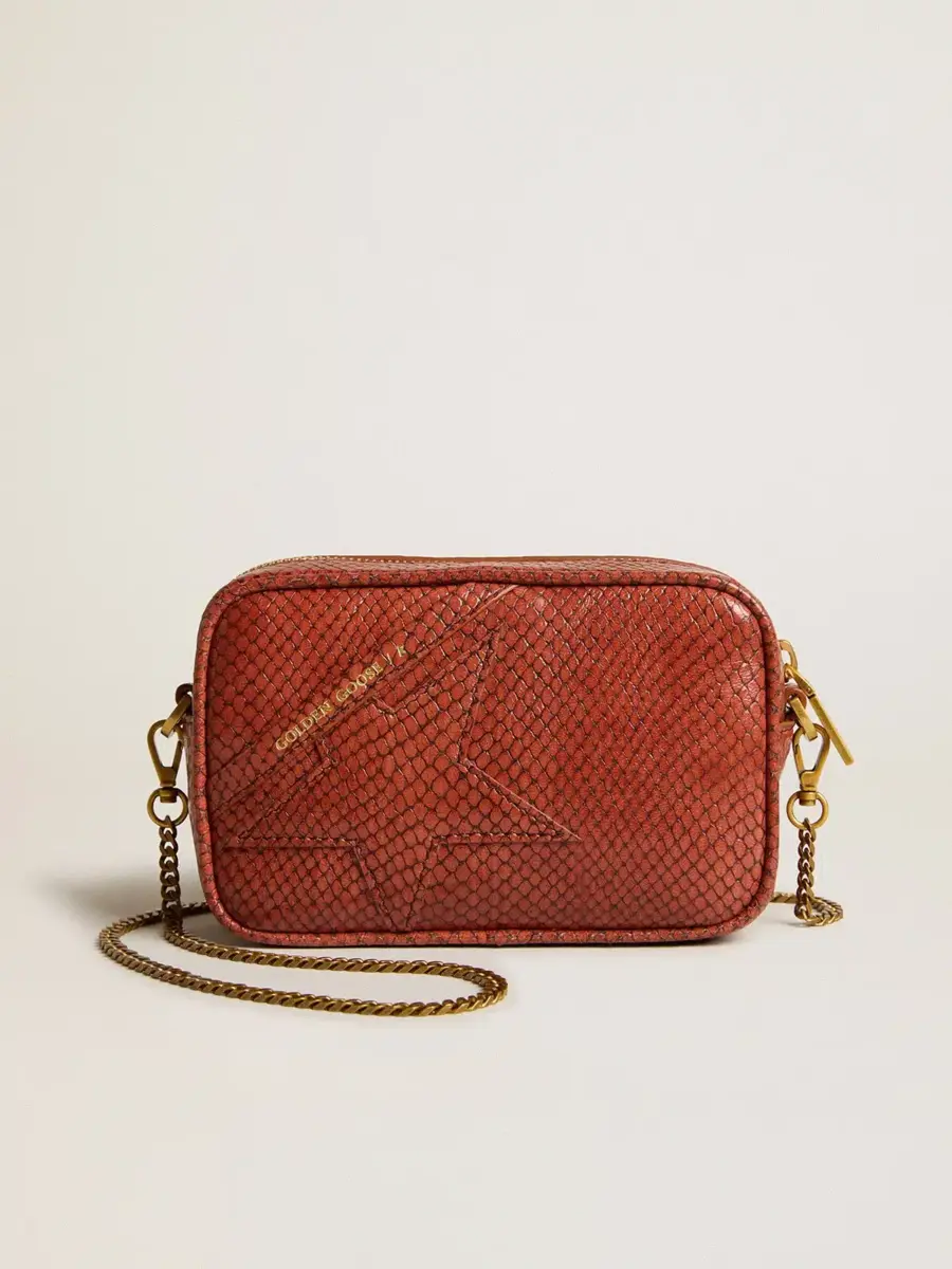 Inspiración vintage, actitud metropolitana. Un accesorio versátil que captura el diseño clásico de las bolsas para cámaras y destaca por sus detalles refinados, ahora también en versión mini. Este modelo, en piel color óxido con estampado de serpiente, presenta una estrella tono sobre tono en piel martillada. La cadena dorada para el hombro y el logotipo dorado en contraste que decora la parte delantera completan el look.