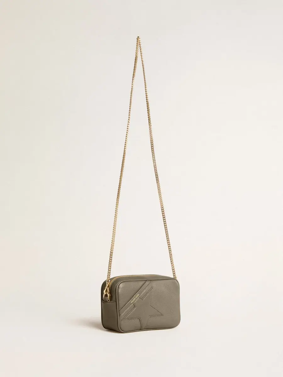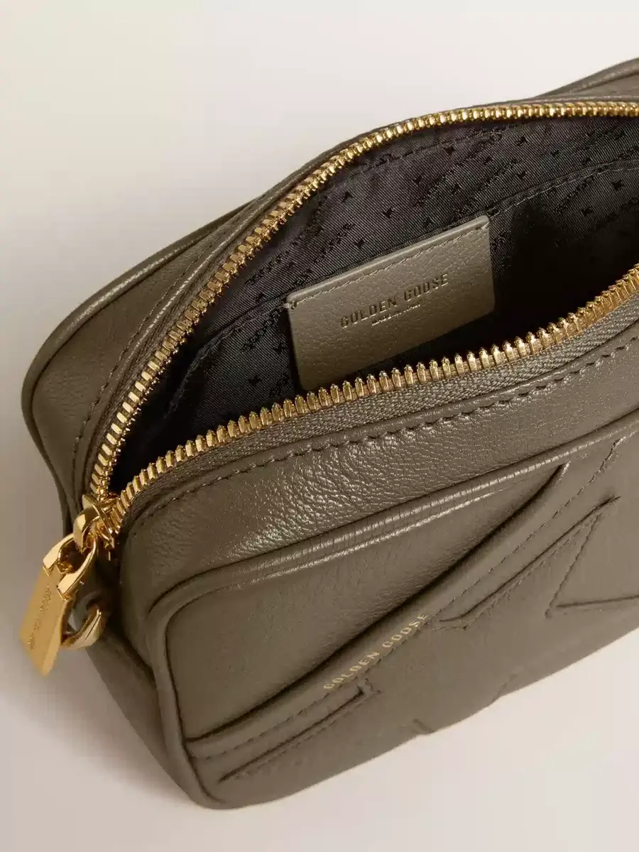 Inspiración vintage, actitud metropolitana. Un accesorio versátil que captura el diseño clásico de los bolsos tipo cámara y destaca por sus refinados detalles. Este modelo en piel verde salvia presenta una estrella tono sobre tono. El logotipo dorado en contraste que decora la parte delantera completa el look.