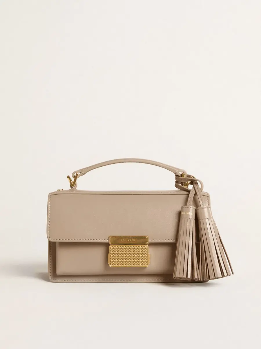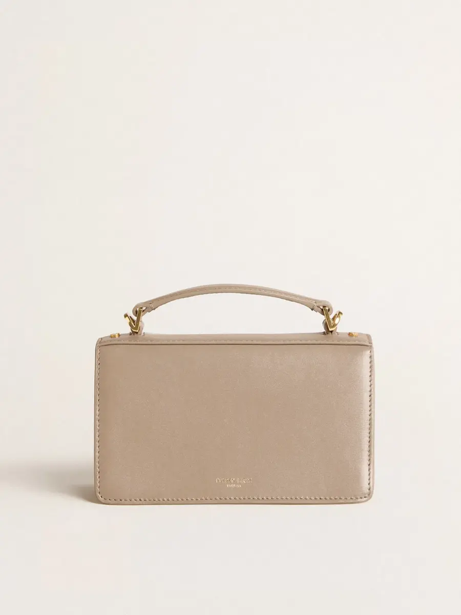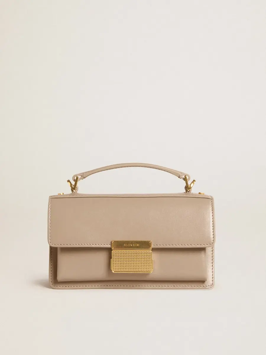 Funcional y sofisticado, nuestro bolso Venezia es una declaración de elegancia veneciana que te invita a llevar contigo un pedazo de su alma allá donde vayas. En piel beige con bordes, la versión pequeña de este modelo cuenta con un cierre de hebilla dorada y detalles metálicos dorados. El doble bolsillo interior le da el toque final.