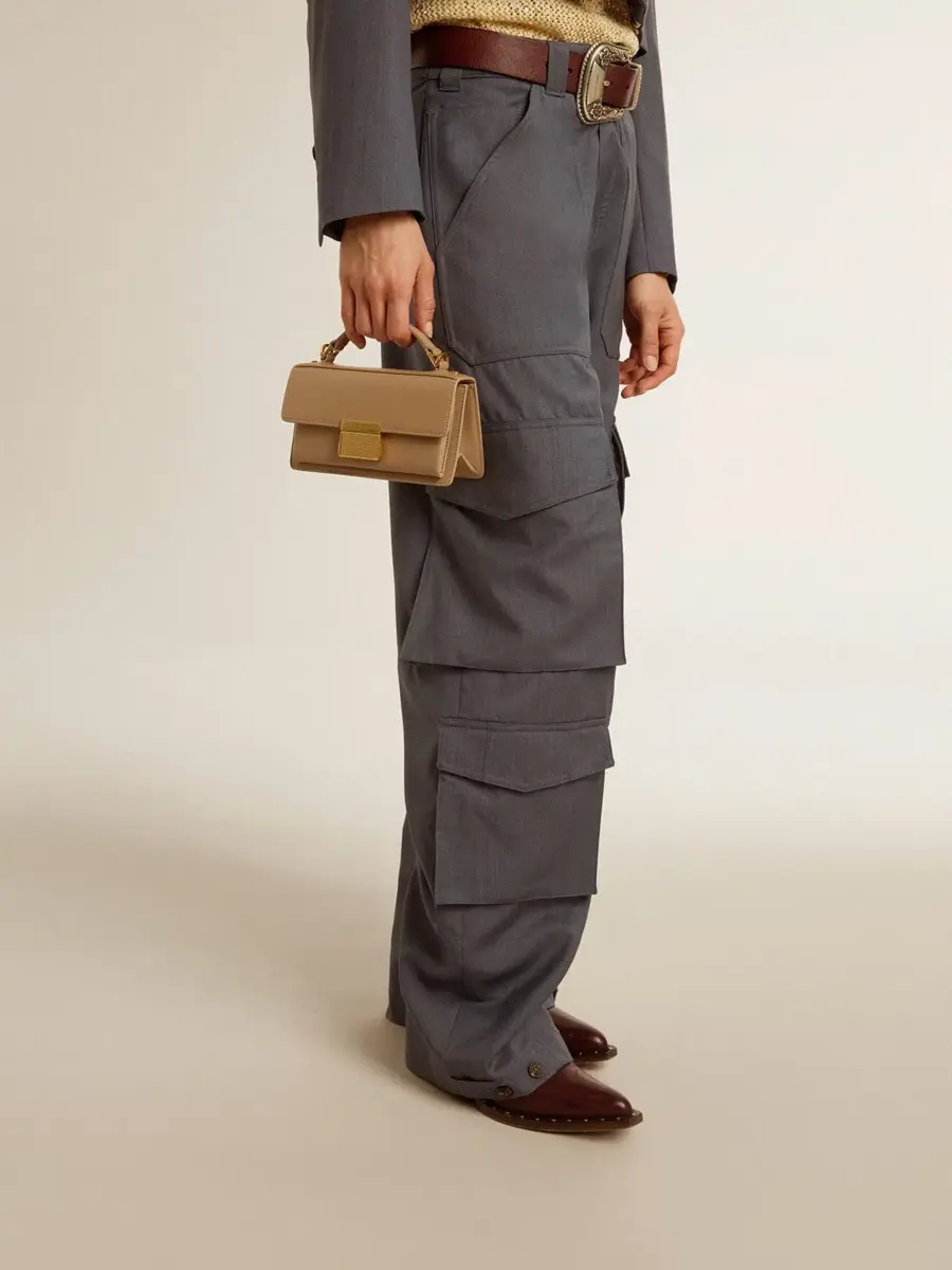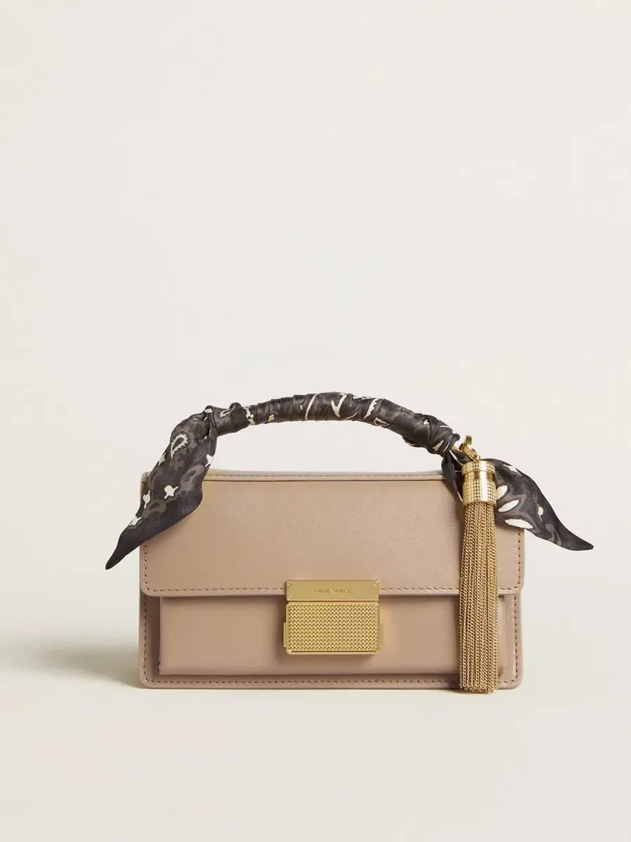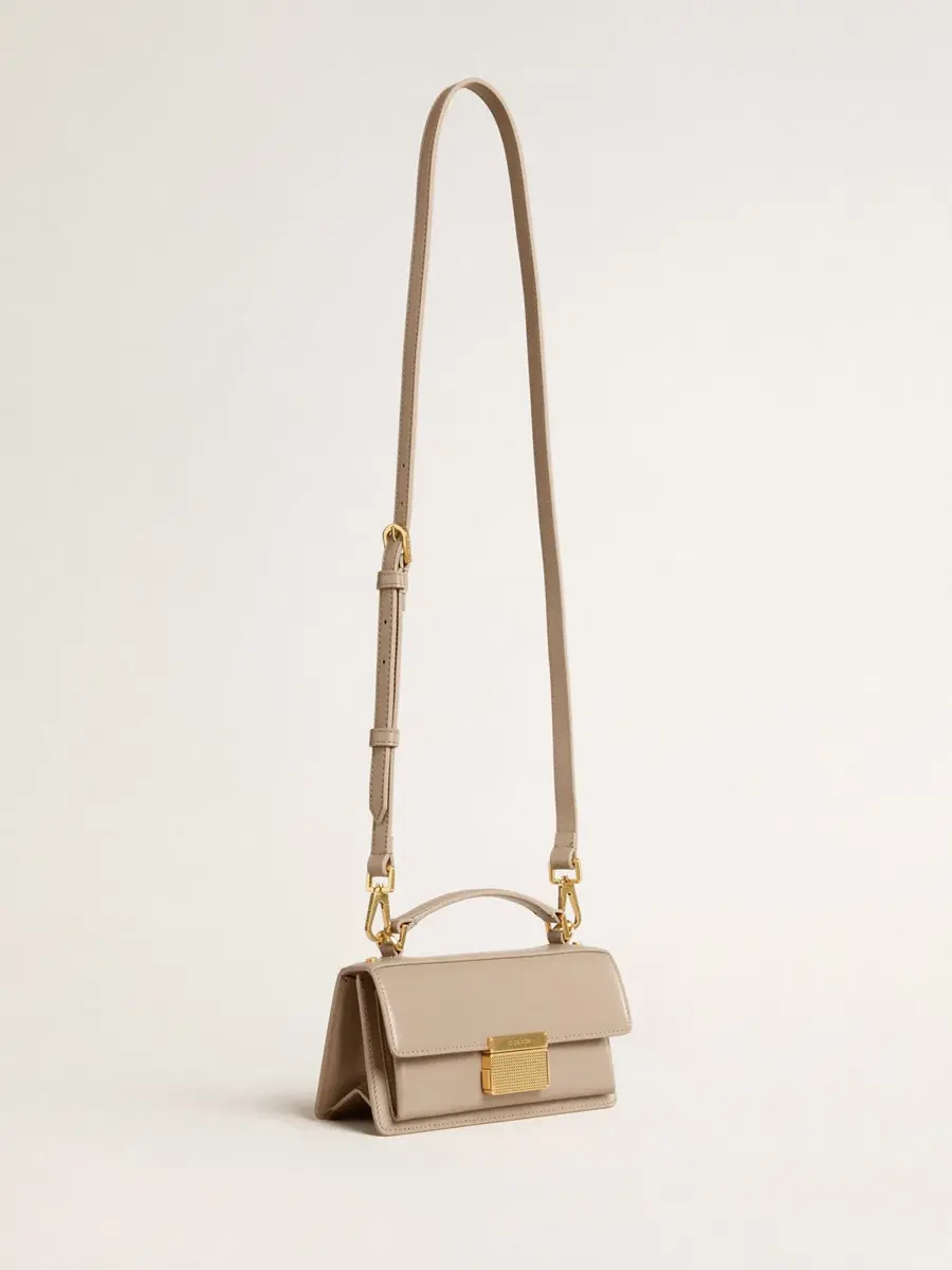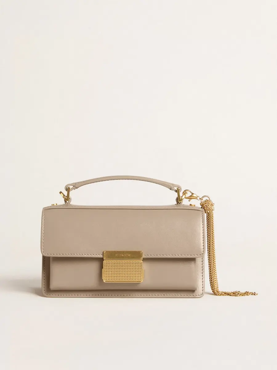 Funcional y sofisticado, nuestro bolso Venezia es una declaración de elegancia veneciana que te invita a llevar contigo un pedazo de su alma allá donde vayas. En piel beige con bordes, la versión pequeña de este modelo cuenta con un cierre de hebilla dorada y detalles metálicos dorados. El doble bolsillo interior le da el toque final.
