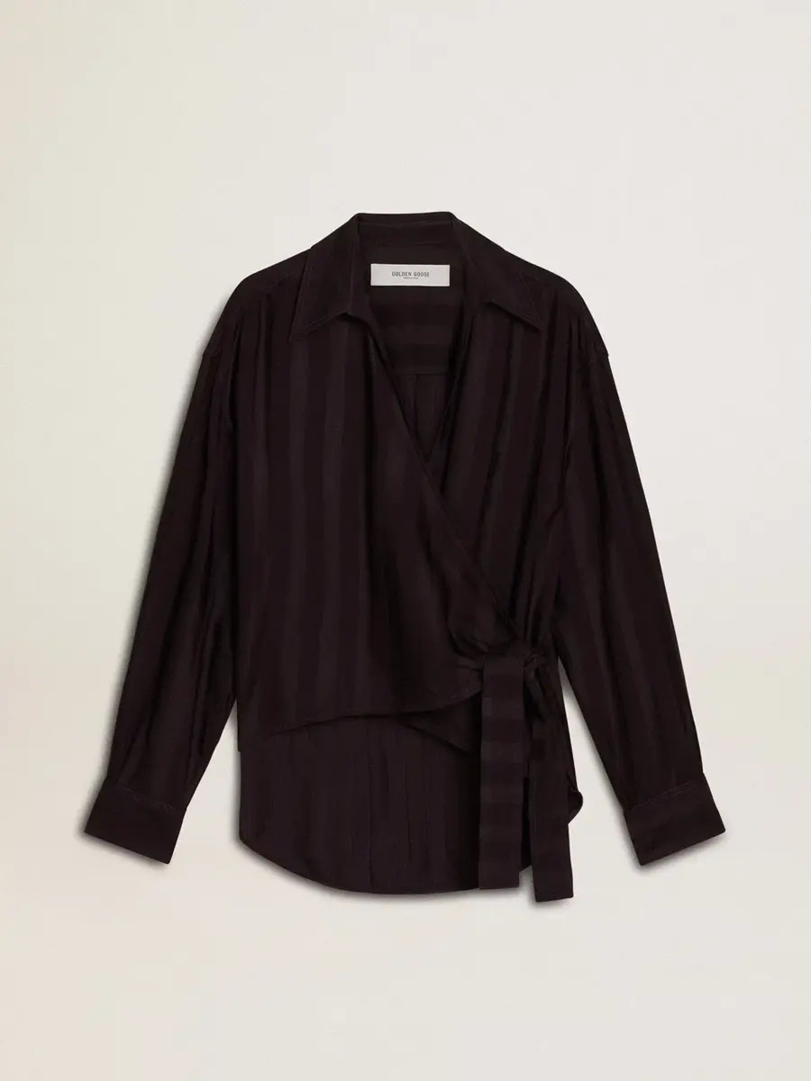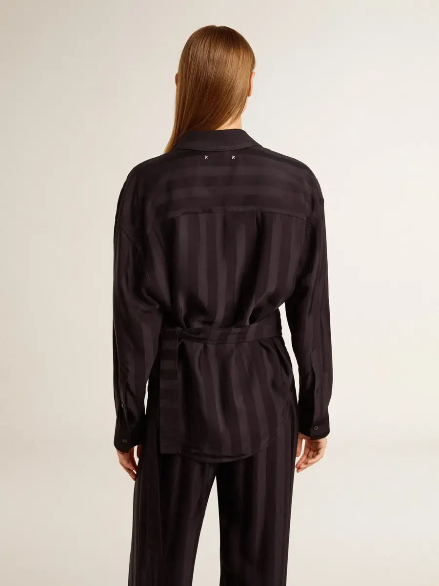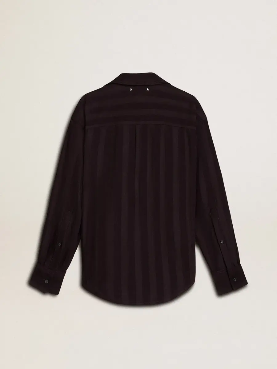 Inspirada en la energía eléctrica de los años noventa, la colección celebra el poder ilimitado de los sueños compartidos. Movidos por la pasión, cada diseño captura el significado de la unión y el poder de la música. Esta camisa negra con rayas verticales tono sobre tono presenta un cierre con nudo lateral y un corte oversize. La doble estrella en la espalda le da el toque final.