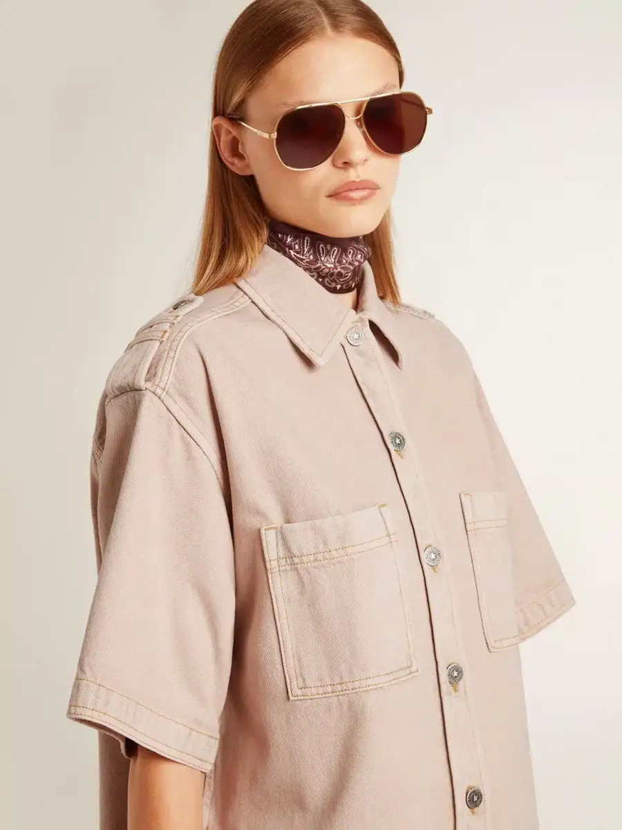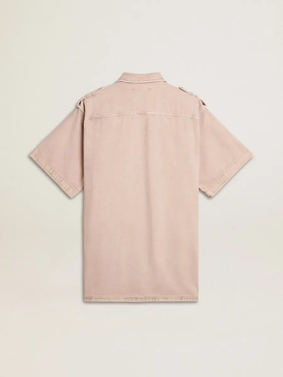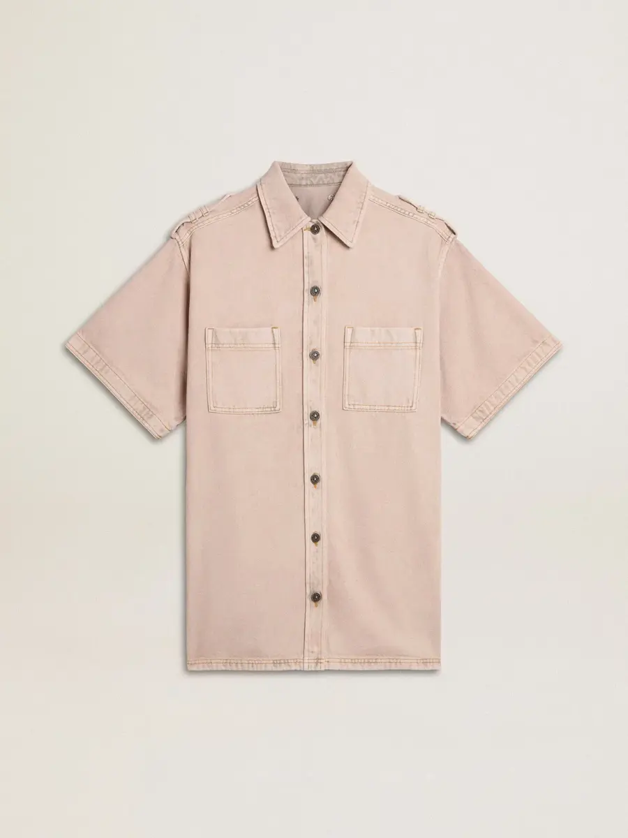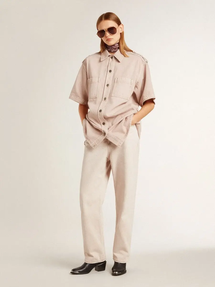 Una colección inspirada en la armonía de la naturaleza, donde cada detalle fluye con naturalidad. Esta camisa vaquera de algodón con corte oversize se caracteriza por un proceso de confección artesanal especial, único en cada pieza: originalmente negra, se lava y se tiñe varias veces para conseguir este distintivo color rosa pastel. Dos bolsillos delanteros, mangas cortas y cierre con botones le dan el toque final.