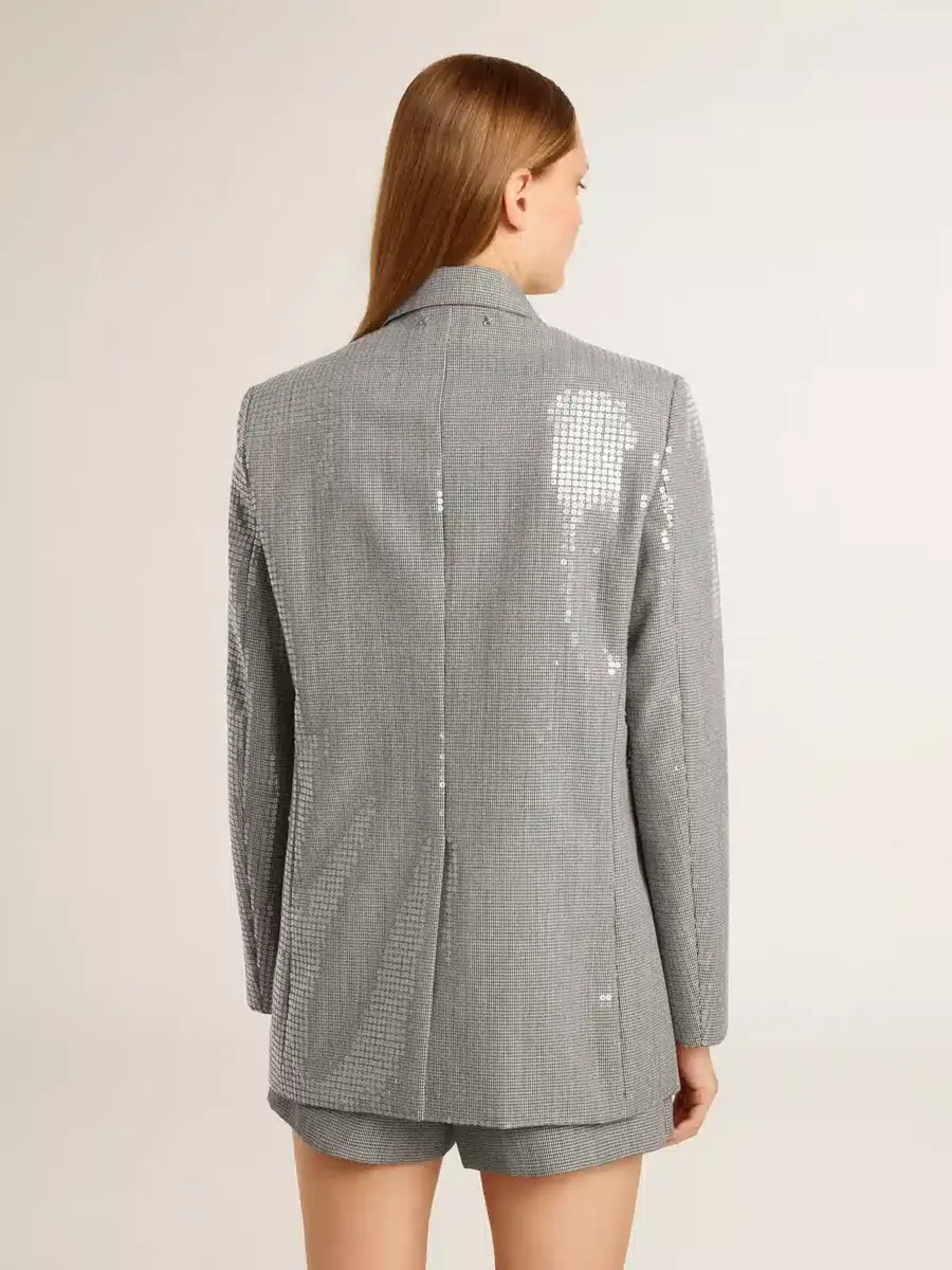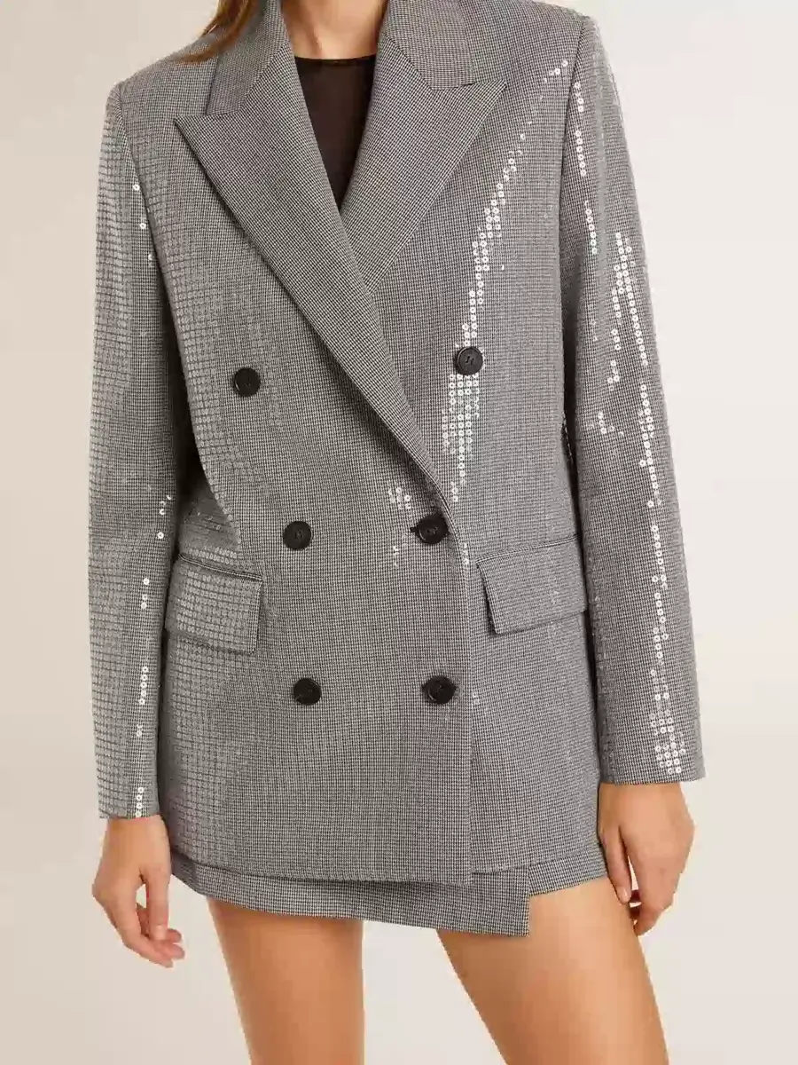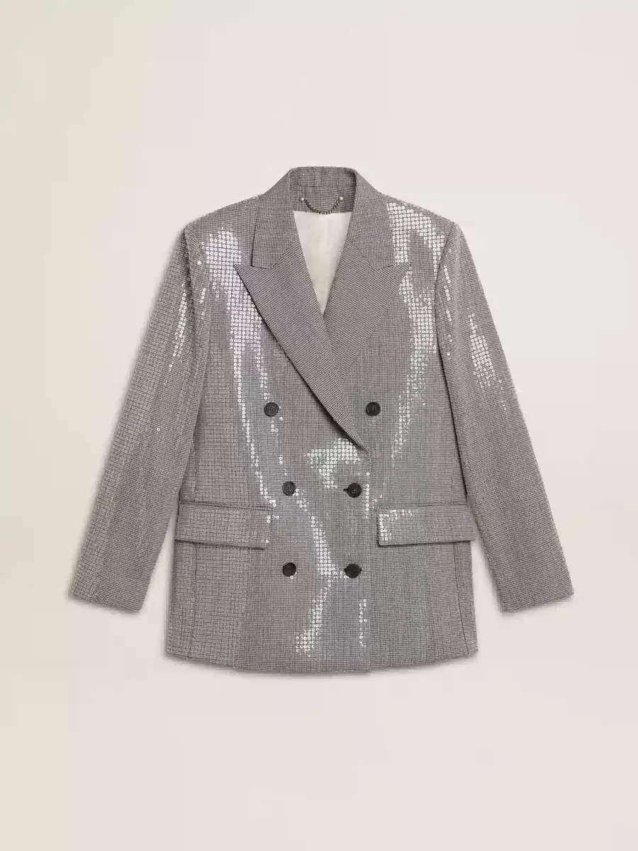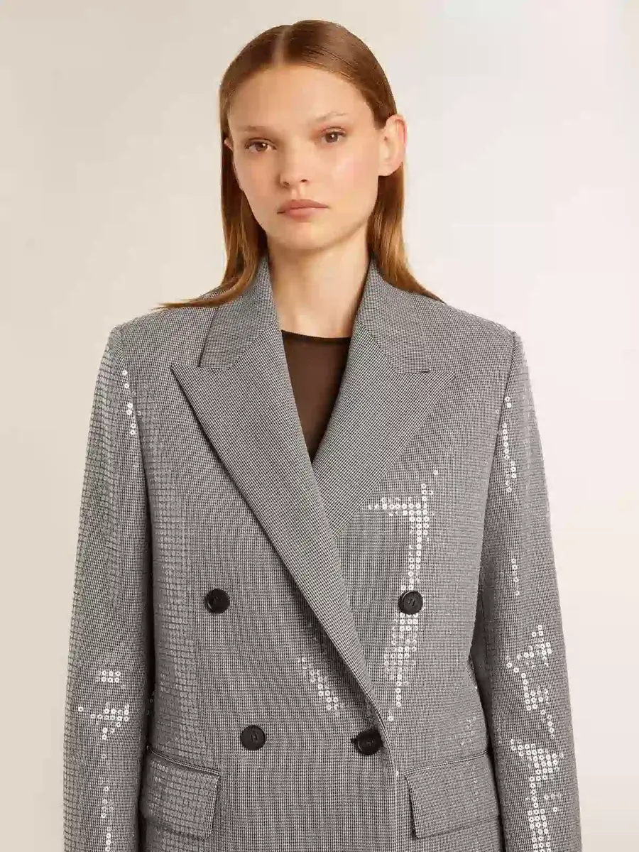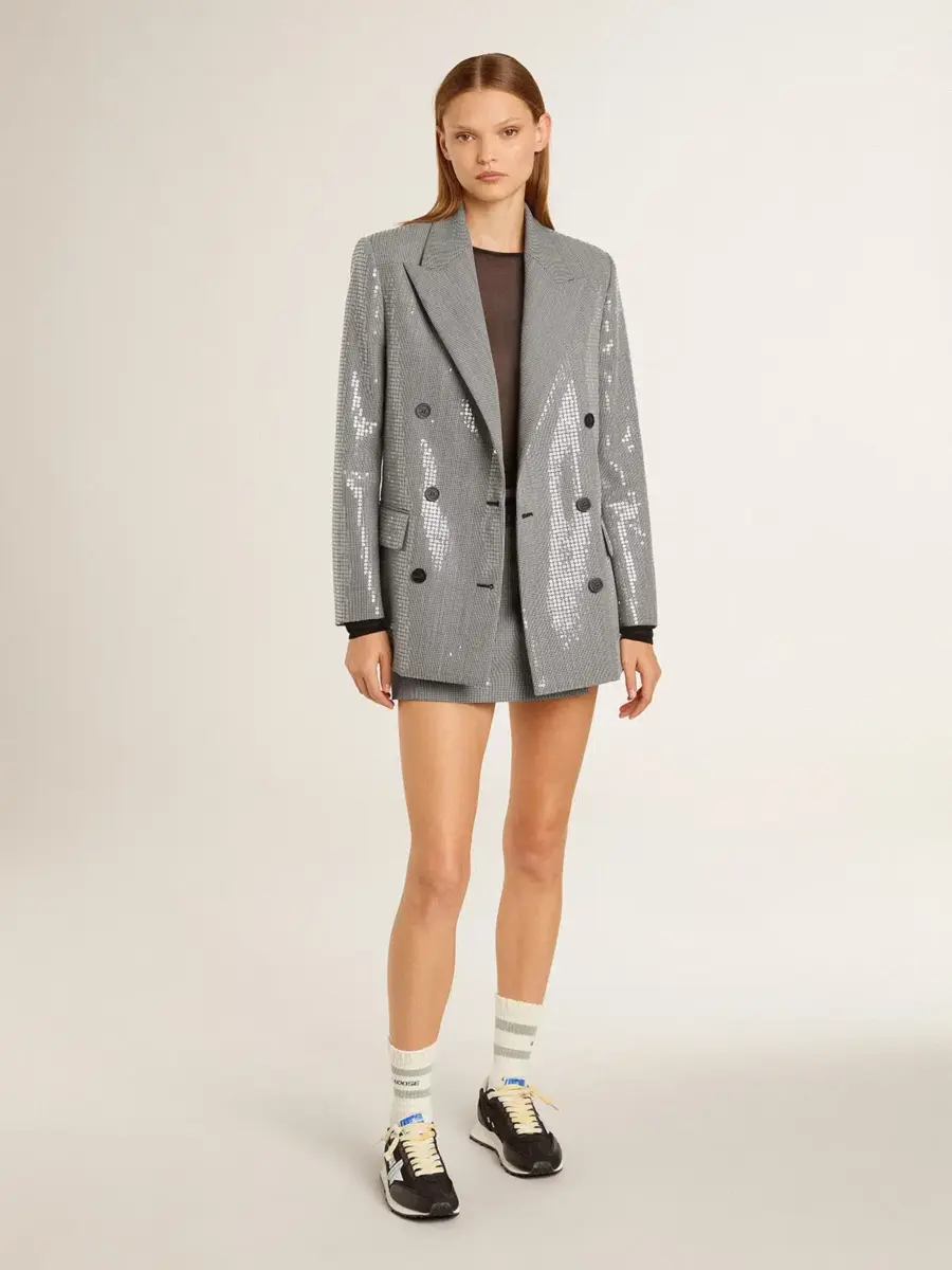 Inspirada en la energía eléctrica de los años noventa, la colección celebra el poder ilimitado de los sueños compartidos. Movidos por la pasión, cada diseño captura el significado de la unión y el poder de la música. Esta chaqueta de lana cruzada con micro estampado de pata de gallo presenta lentejuelas plateadas bordadas en toda la prenda. El cierre de seis botones y el forro interior con el logotipo añaden el toque final.