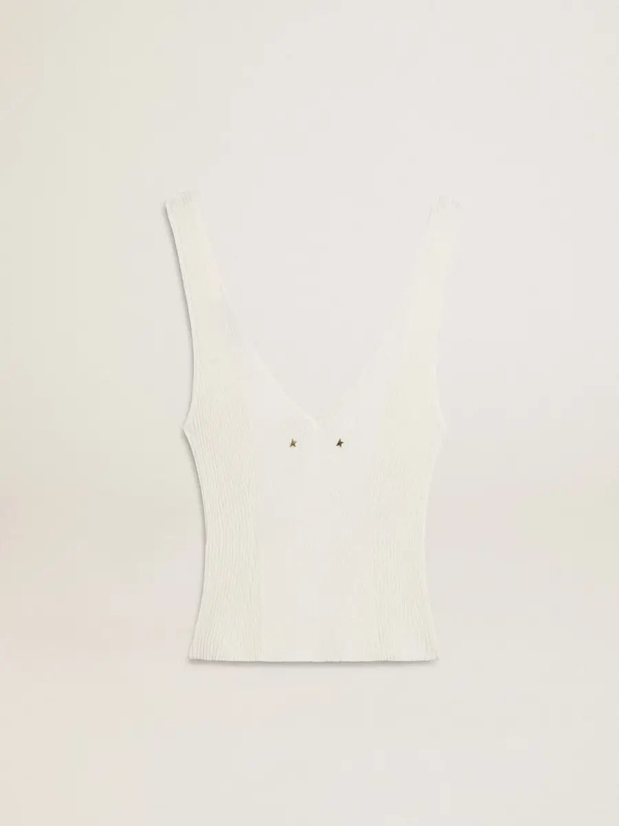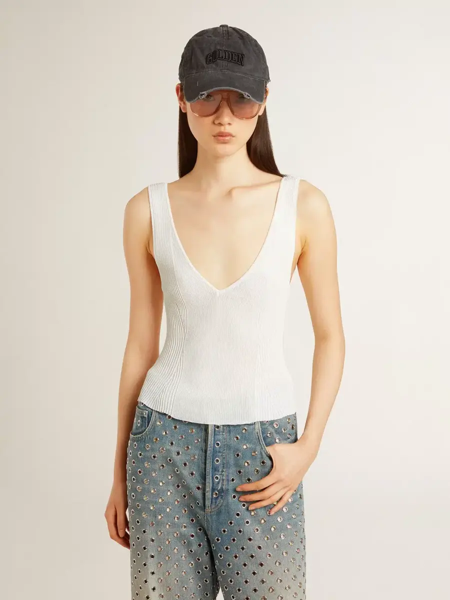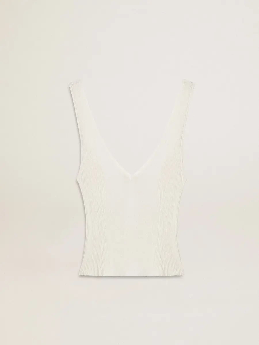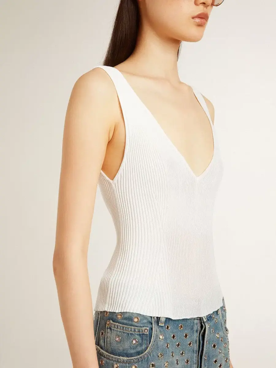 Inspirada en la energía eléctrica de los años noventa, la colección celebra el poder ilimitado de los sueños compartidos. Movidos por la pasión, cada diseño captura el significado de la unión y el poder de la música. En color blanco desgastado, este top presenta bordados acanalados tono sobre tono y un maxi escote en V en la parte delantera y trasera.