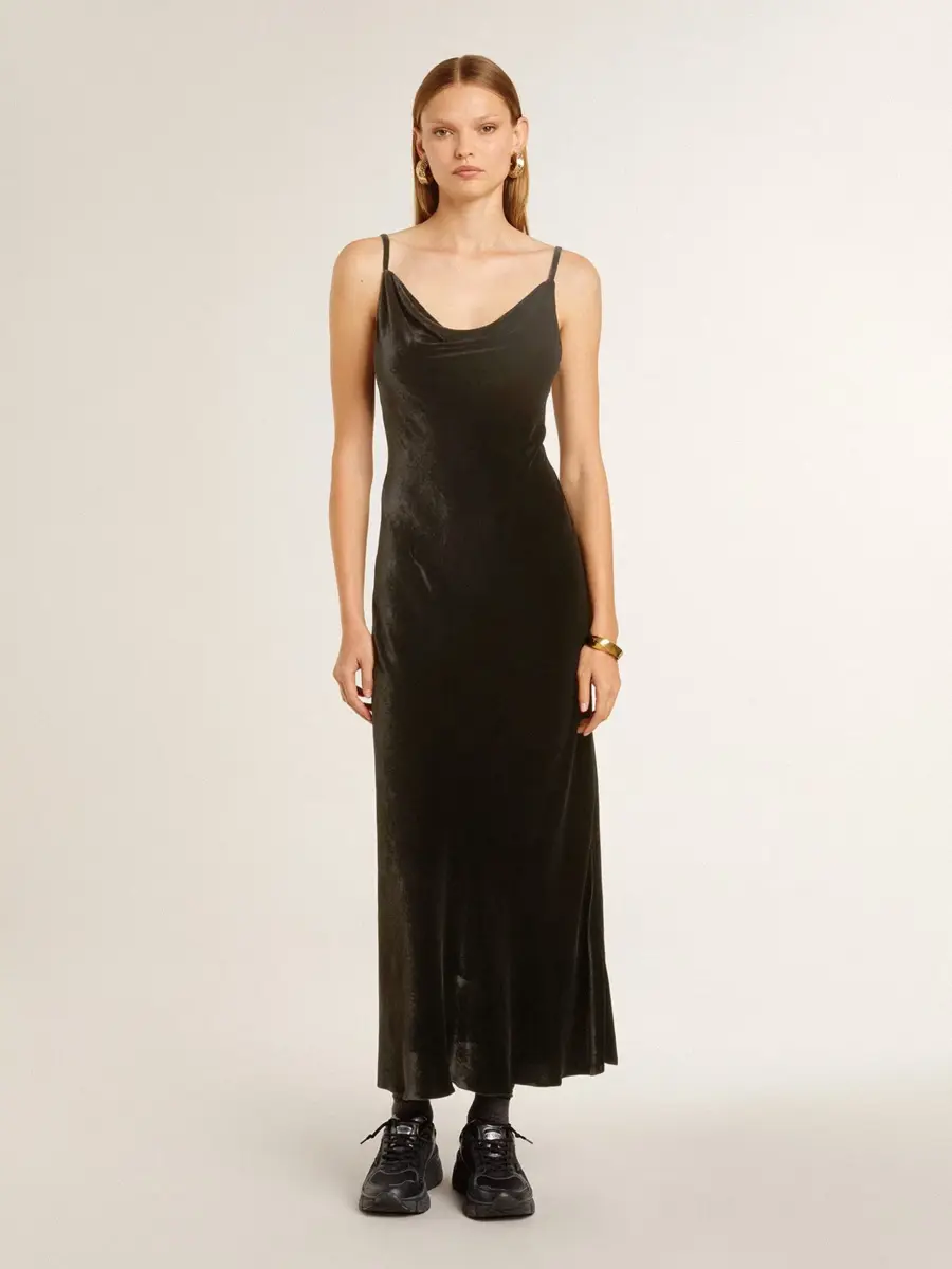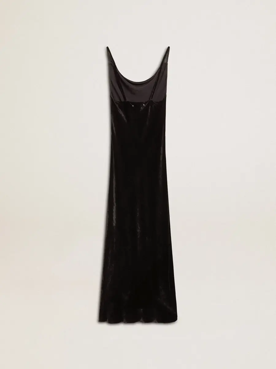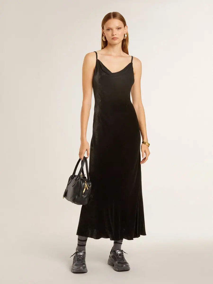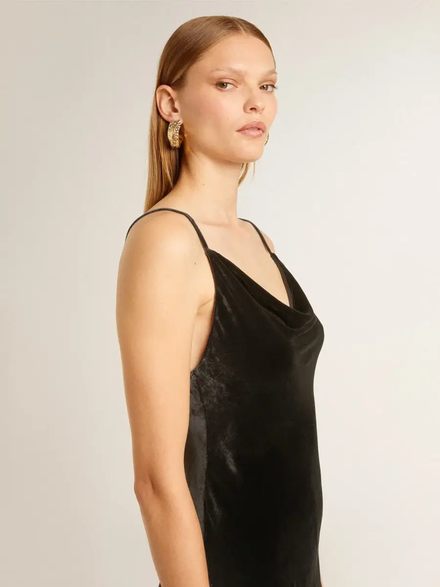 Inspirada en la energía eléctrica de los años noventa, la colección celebra el poder ilimitado de los sueños compartidos. Movidos por la pasión, cada diseño captura el significado de la unión y el poder de la música. Sin mangas y con cuello vuelto, este vestido lencero negro marfil presenta un efecto terciopelo y un corte holgado. La doble estrella en la espalda le da el toque final.