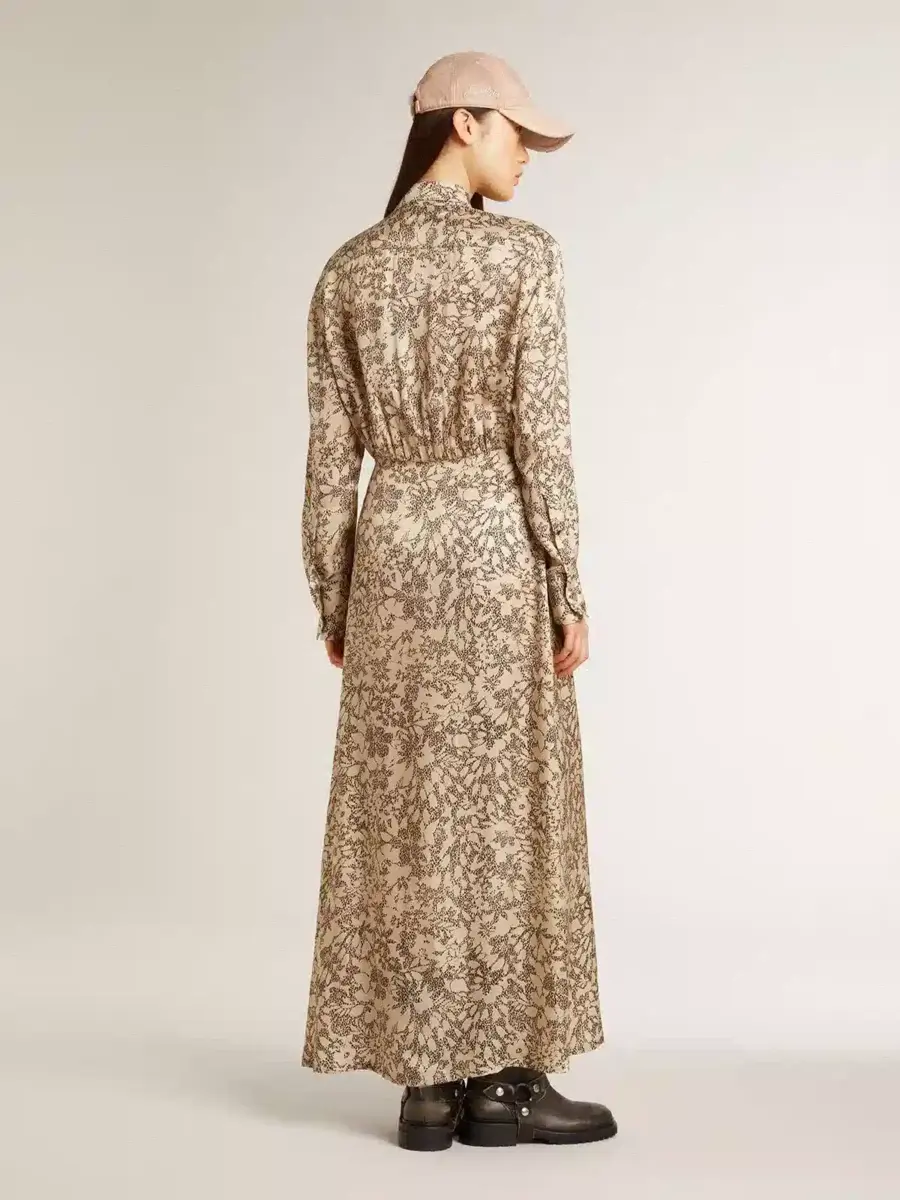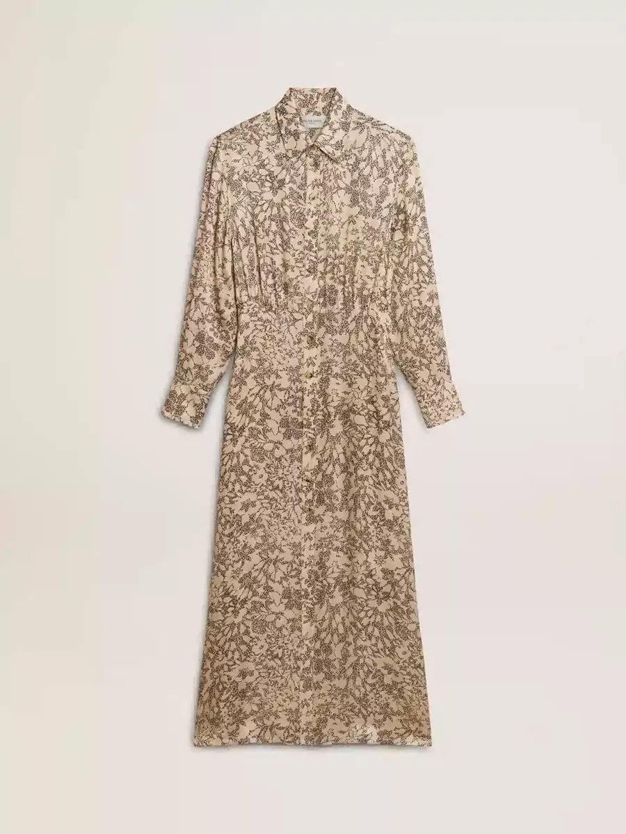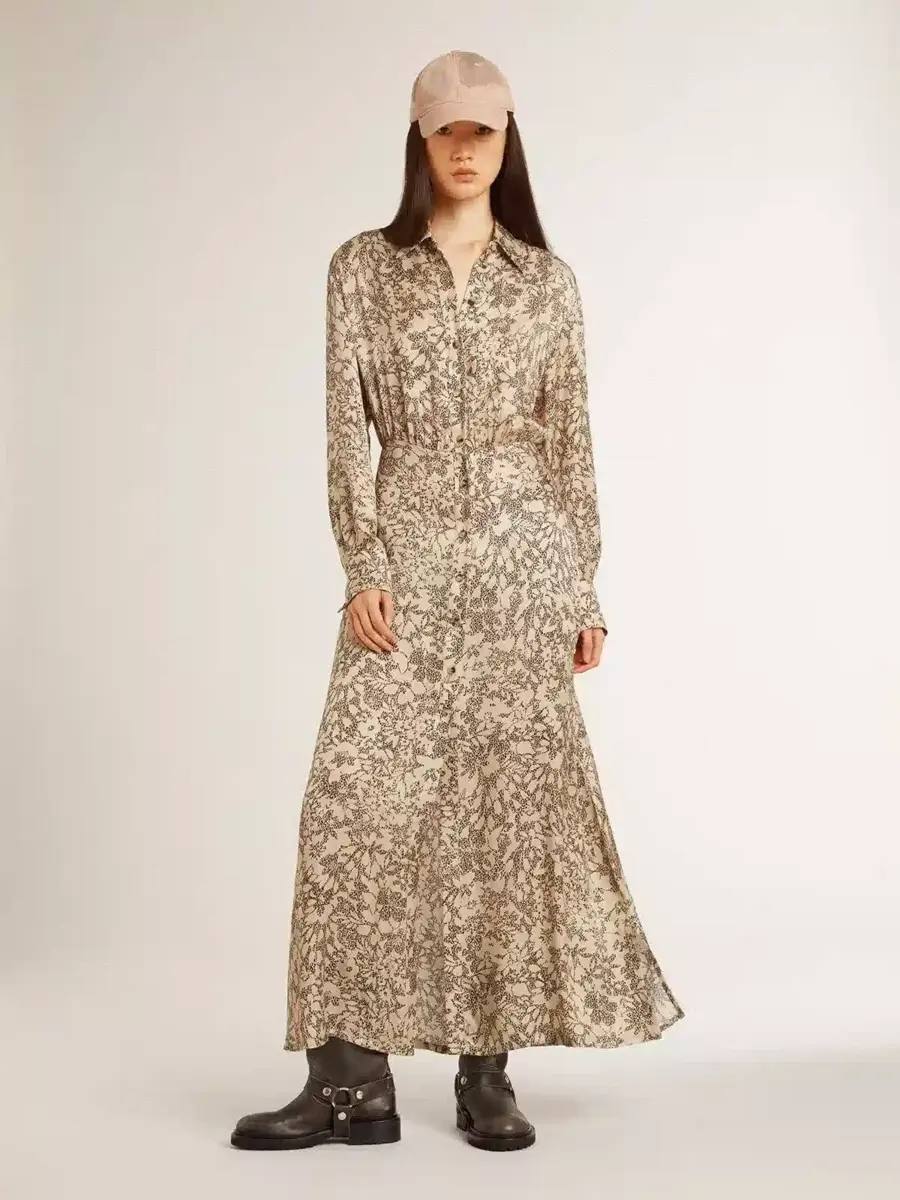 Una colección inspirada en la armonía de la naturaleza, donde cada detalle fluye con naturalidad. Confeccionado en mezcla de seda, este vestido midi presenta un estampado floral y mangas largas. Los botones de cuerno con el logotipo añaden el toque final.