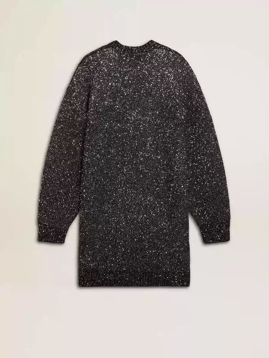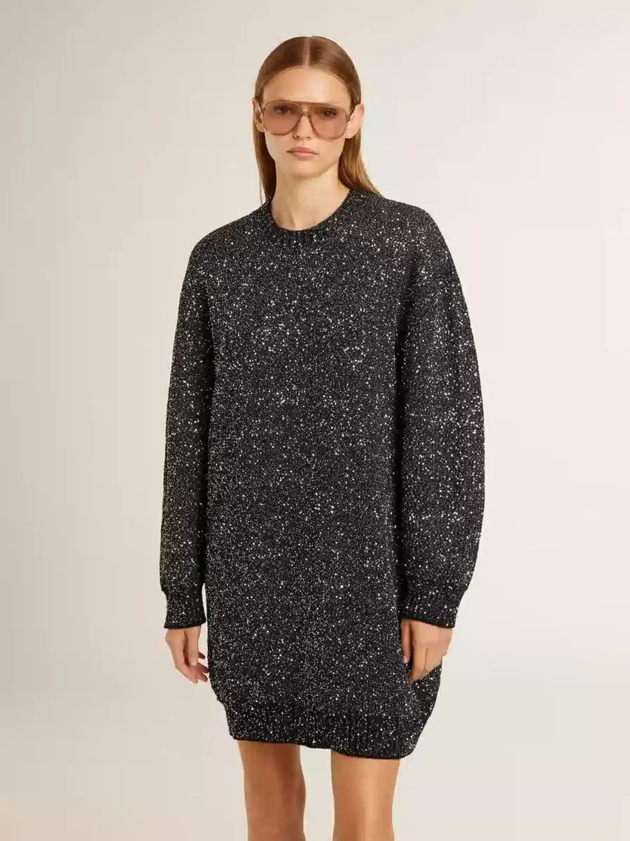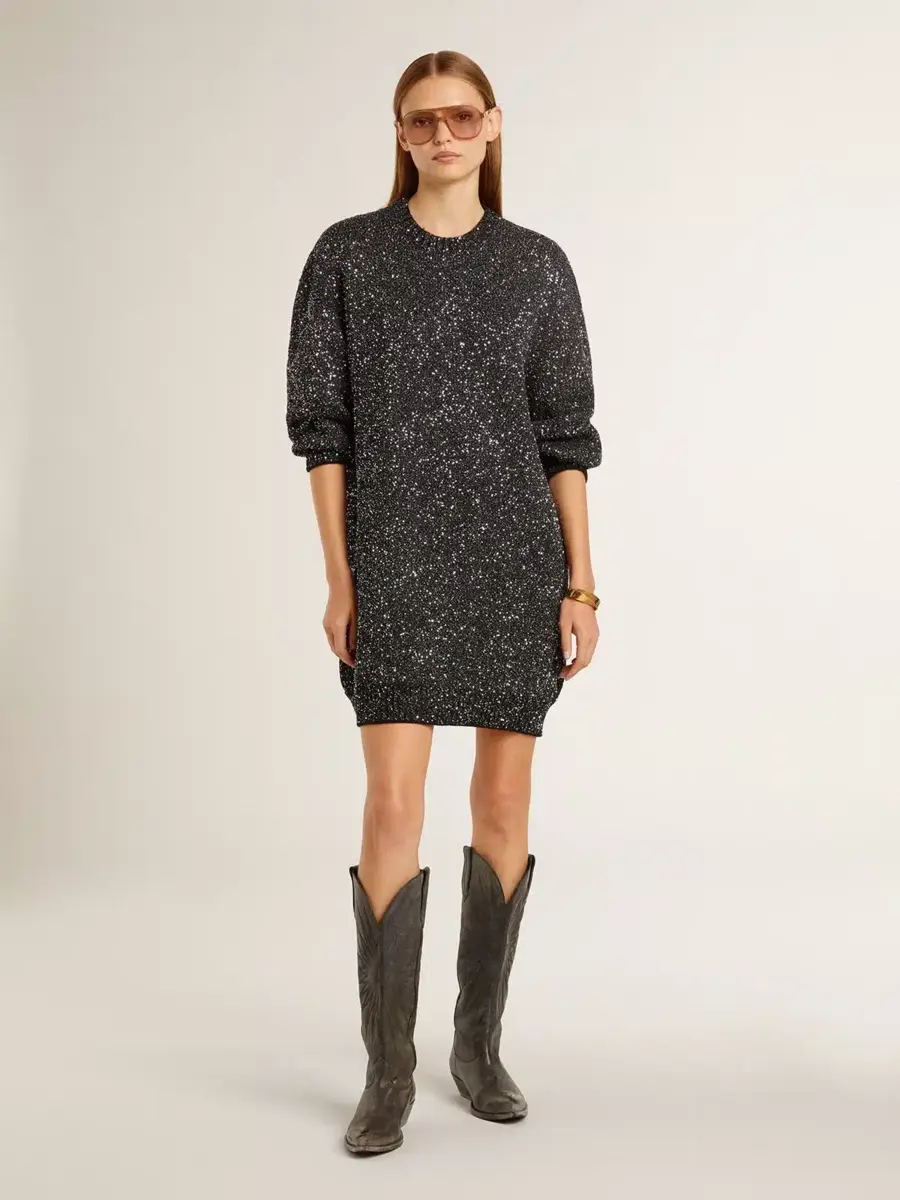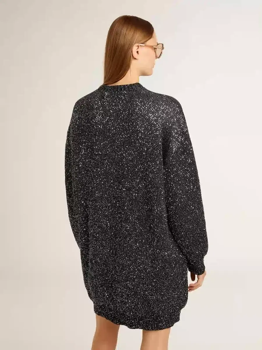 Inspirada en la energía eléctrica de los años noventa, la colección celebra el poder ilimitado de los sueños compartidos. Movidos por la pasión, cada diseño captura el significado de la unión y el poder de la música. Confeccionado en una mezcla de lana, este vestido negro de cuello redondo con corte oversize presenta lentejuelas plateadas por toda la prenda, lo que lo convierte en la pieza perfecta para cualquier ocasión festiva.