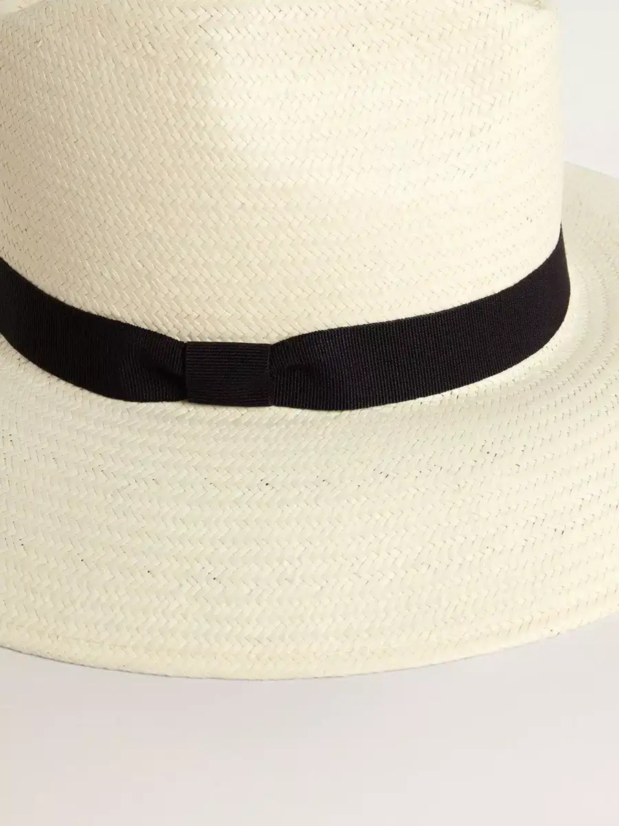 La colección Resort 2025 te invita a ralentizar el ritmo y disfrutar de la belleza natural de la vida mediterránea. Una celebración de las texturas vividas, los ritmos relajados y la elegancia discreta que se entreteje en los momentos más sencillos de la vida. Este sombrero de paja blanca natural, estilo fedora, está adornado con un estampado marino en tonos azules bajo el ala y una cinta negra en contraste. Inspirado en los looks clásicos de la Riviera, combina protección y estilo atemporal.