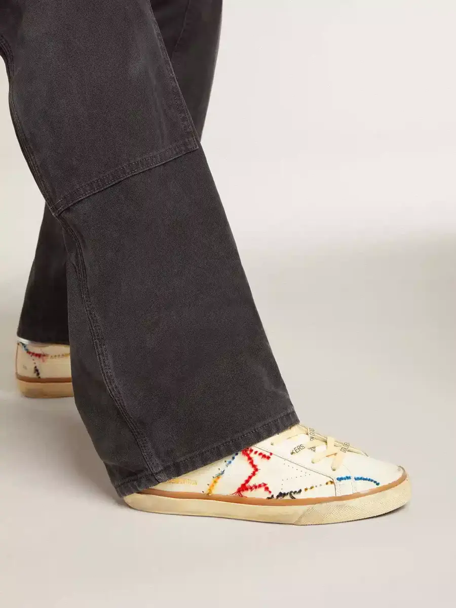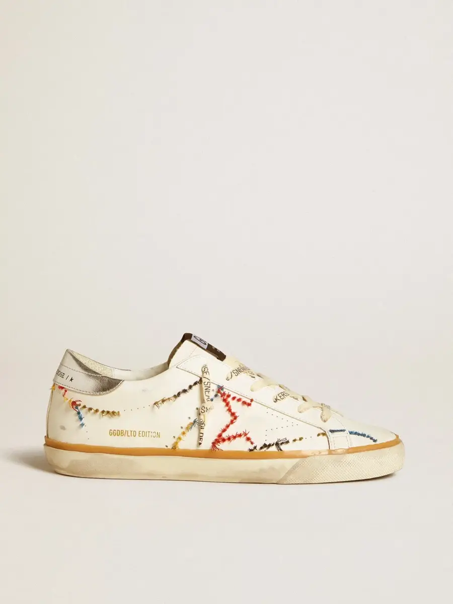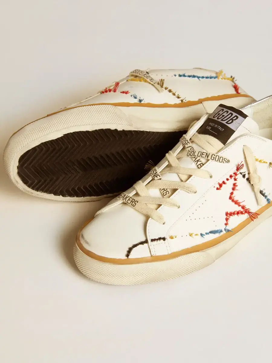 Un icono atemporal, pero en constante evolución. En Golden, nos encanta retocar nuestros clásicos constantemente, siempre desde un nuevo ángulo. Estas Super-Star para mujer, con una parte superior de cuero blanco acentuada por bordados multicolores con efecto deshilachado, cuentan con una estrella perforada y una lengüeta metálica plateada en el talón. El ribete beige y los cordones blancos con el logotipo negro en contraste añaden el toque final.