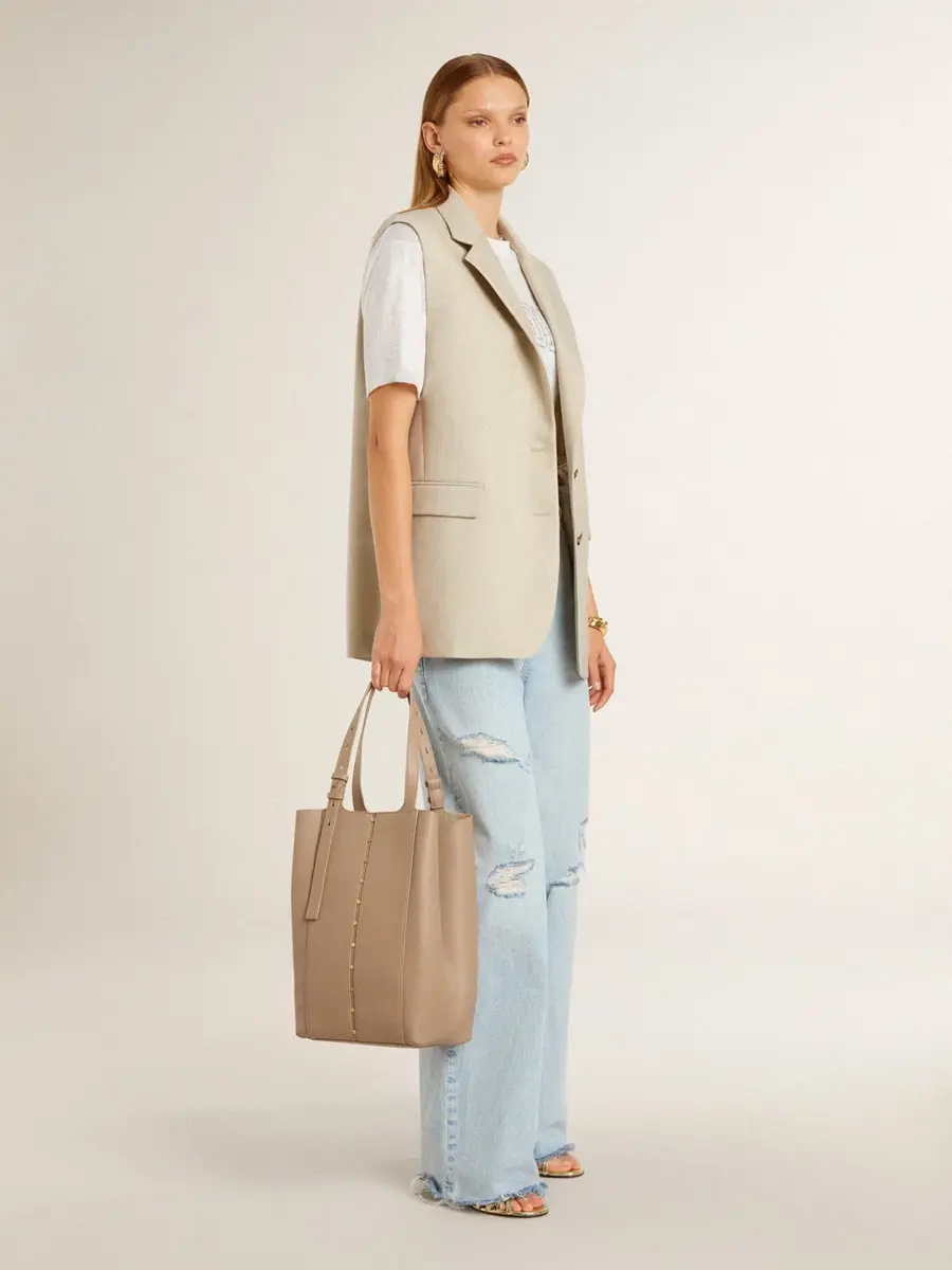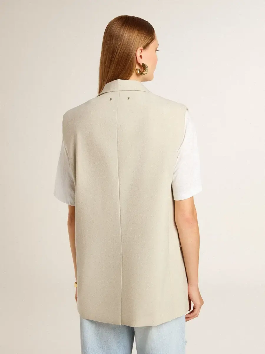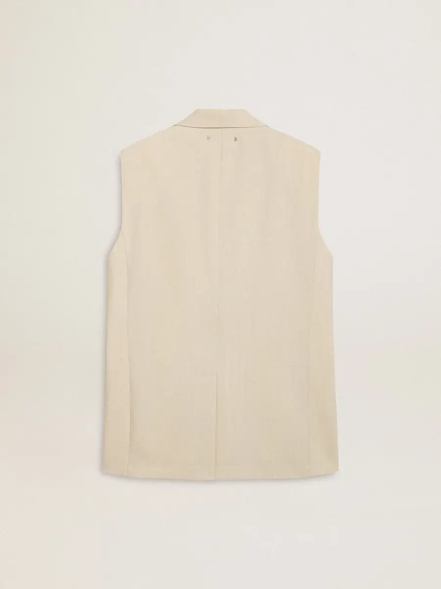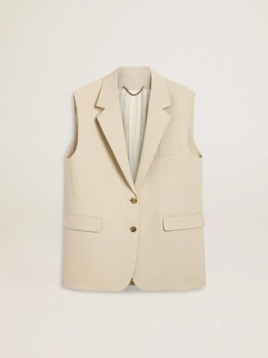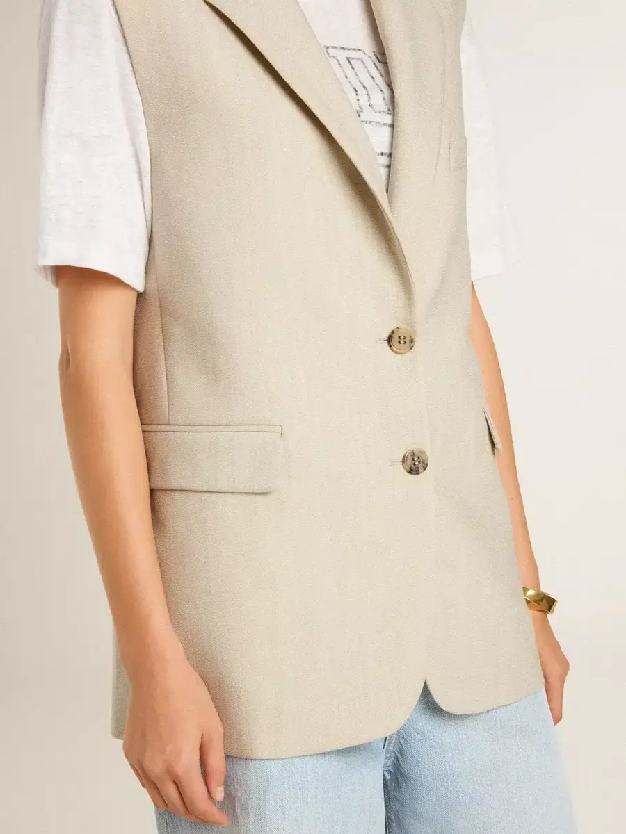 Abrazando la esencia de la temporada, esta colección irradia vitalidad y libertad, combinando una elegancia aireada con chispas dinámicas de energía. Esta chaqueta sin mangas de corte regular para mujer, en mezcla de lana caqui, cuenta con un cierre con dos botones de cuerno con el logotipo. Dos bolsillos y un forro a rayas le dan el toque final.