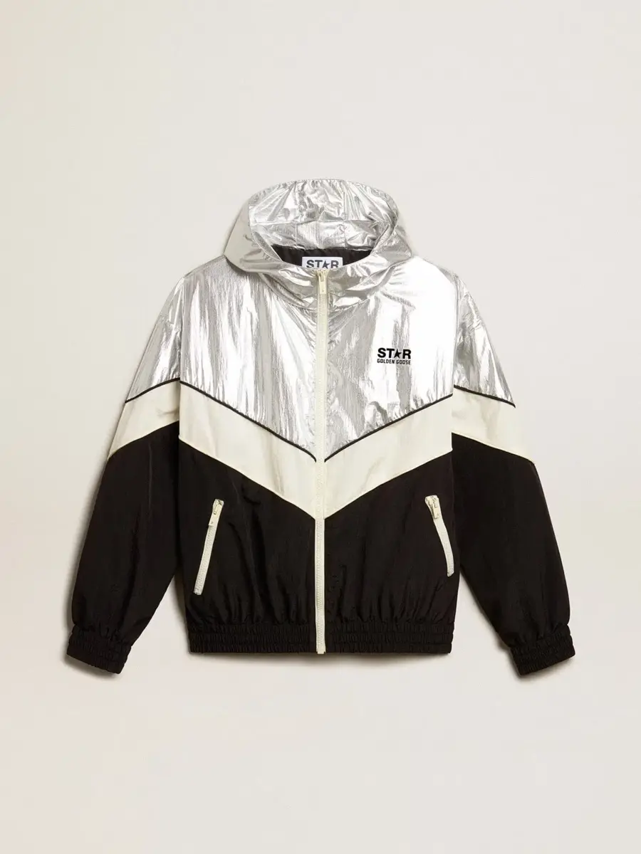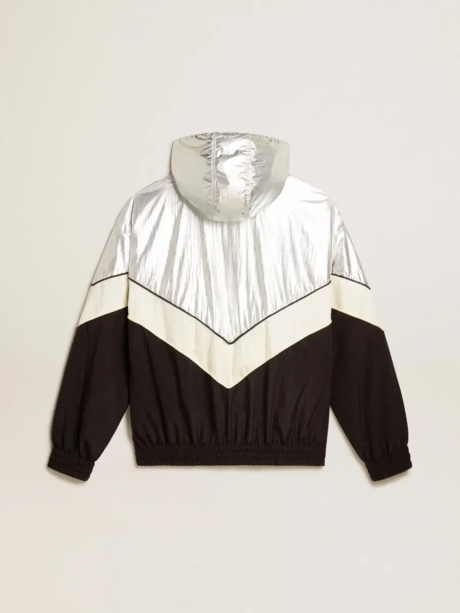 Chaqueta cortavientos para mujer en tejido técnico plateado y negro