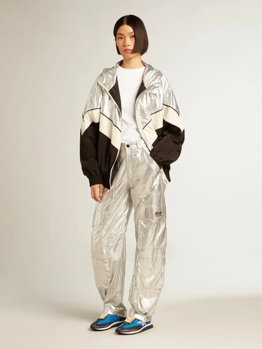 Sé el primero en valorar “Chaqueta cortavientos para mujer en tejido técnico plateado y negro”
