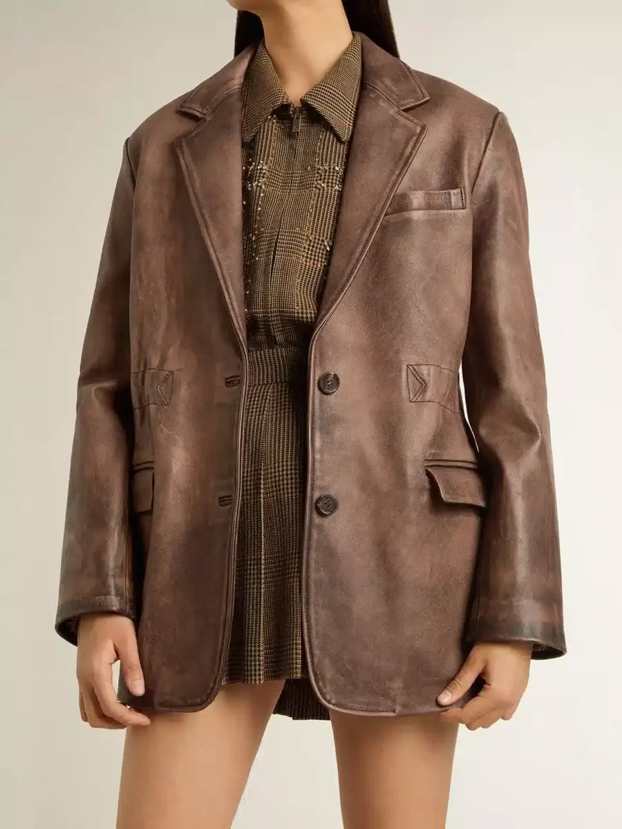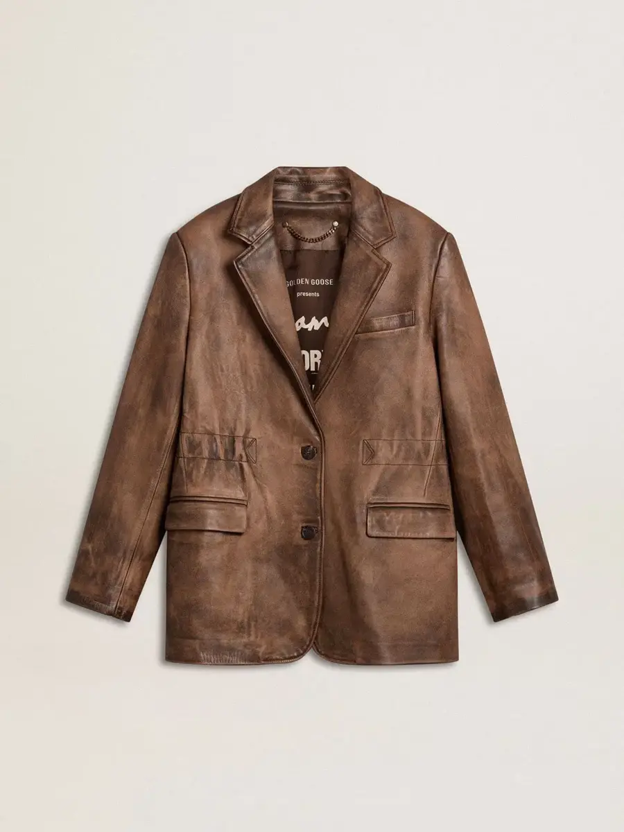 La segunda entrega de la colección Otoño/Invierno 25 se desarrolla como un viaje relajado y refrescante, entretejido en el tejido de cada una de las piezas. Confeccionada en piel de vacuno marrón, esta chaqueta motera oversize para mujer presenta un tratamiento desgastado. La cintura elástica, los dos bolsillos y el cierre de dos botones le dan el toque final.